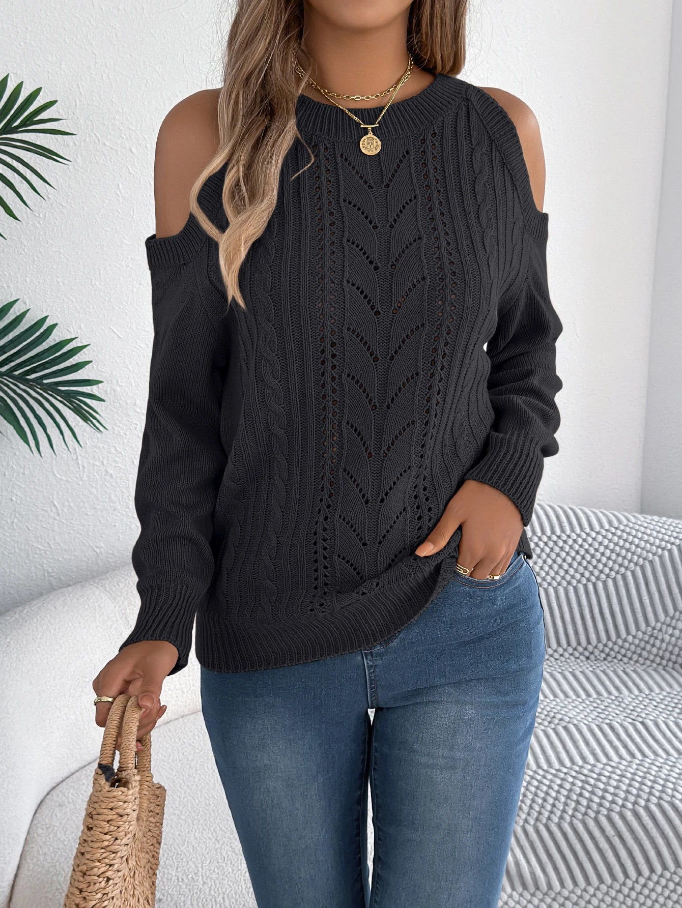 Šiks plecu izgriezuma pulovers ar laternu piedurknēm un smalkiem griezuma akcentiem, kas nodrošina izsmalcinātu mājīgu stilu.
