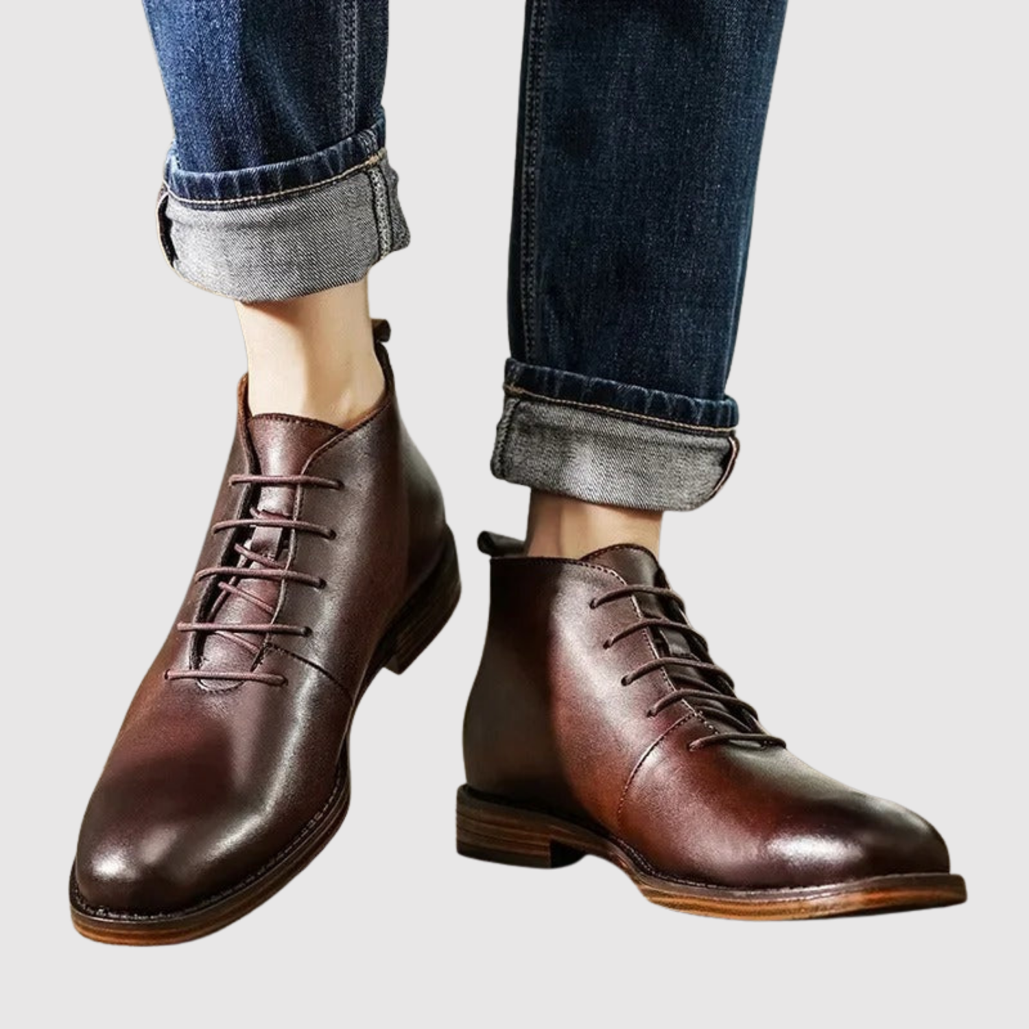 Šie klasiskie ādas zābaki ir izgatavoti no augstākās kvalitātes ādas un apvieno laika pārbaudītu dizainu ar funkcionālu izturību. Izturīgā zole nodrošina stabilitāti, kamēr šņorēšana garantē drošu un regulējamu piegulšanu. Ideāli piemēroti gan ikdienas lietošanai, gan formālākām reizēm.