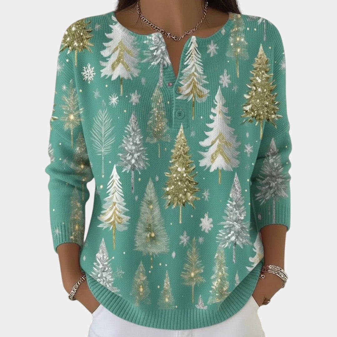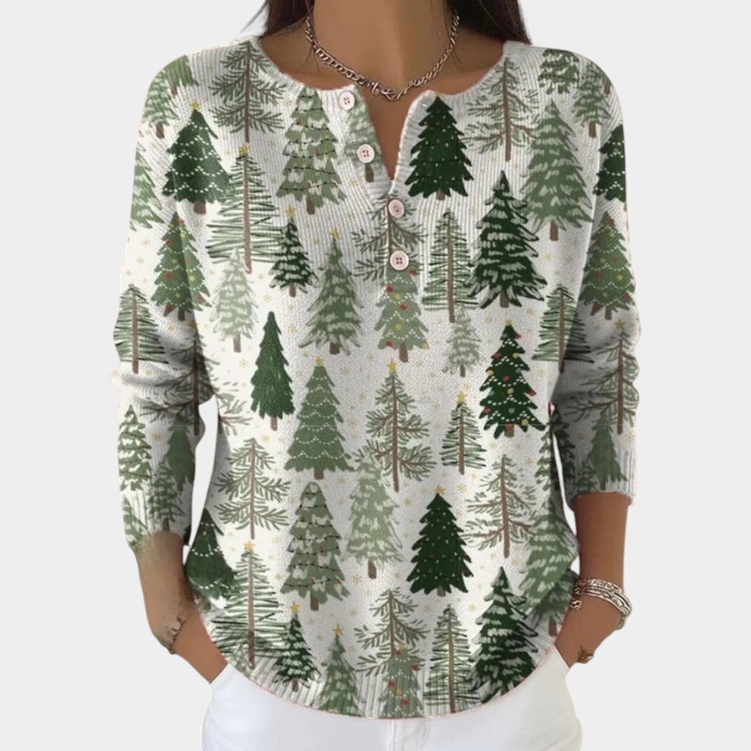 Anete džemperis nekavējoties rada Ziemassvētku noskaņu ar savu priecīgo rakstu, kas attēlo priedes zarus, sniegpārsliņas un sarkanas ziedu akcentus. Mīkstā, adītā auduma sajūta ir patīkama un silda jūs mājīgajās ziemas dienās. Dekoratīvā pogu aizdare ap kaklu piešķir šim svētku izskatam rotaļīgu un sievišķīgu akcentu.