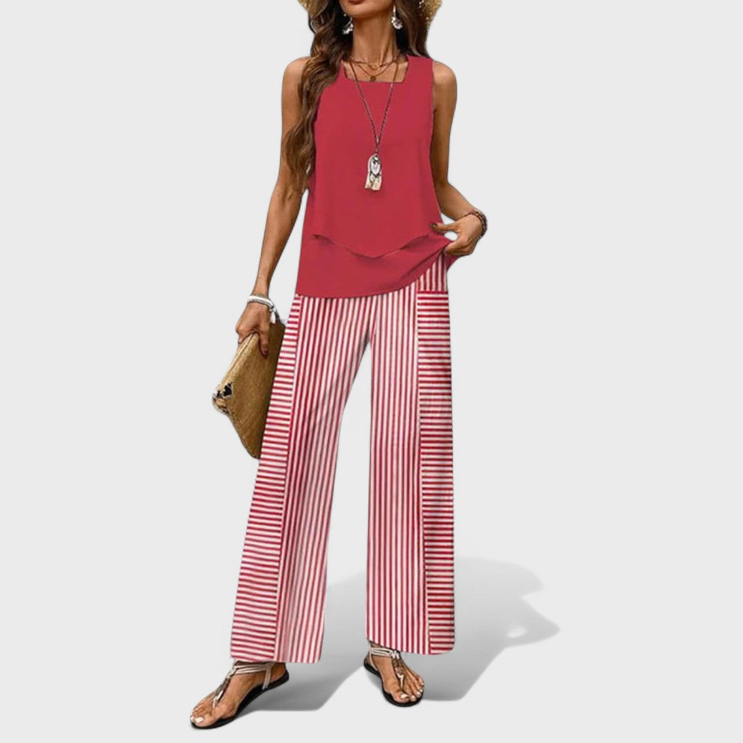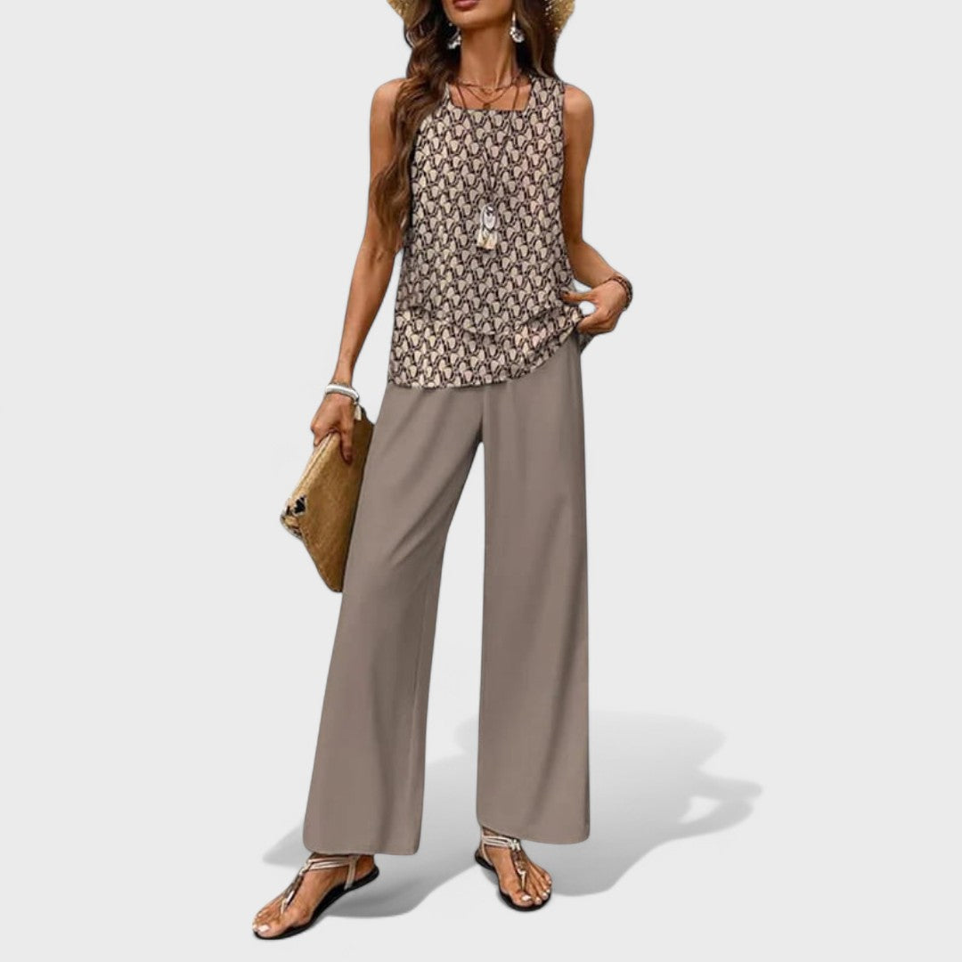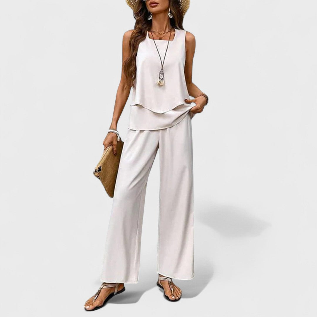 Katarína komplekts piedāvā luksusu vienkāršībā un komfortā stilīgā kombinācijā. Bez piedurknēm topiņš maigi apņem figūru, kamēr vieglās bikses ar brīvu piegriezumu nodrošina gaisīguma un brīvības sajūtu. Izgatavots no kvalitatīva materiāla ar maigu spīdumu, šis komplekts ir lieliska izvēle darba dienām, tikšanās ar draugiem vai elegantiem vasaras vakariem.