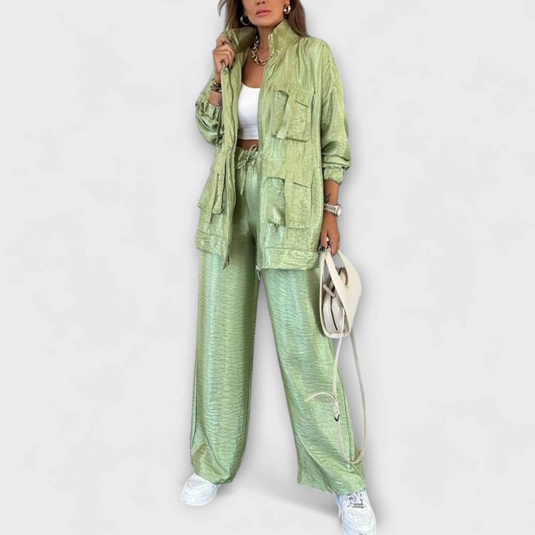 Izstrādāts mūsdienīgajai sievietei, Mira komplekts apvieno elegantu, pielāgotu piegriezumu ar elpojošu, mīkstu materiālu, nodrošinot komfortu visu dienu. Neatkarīgi no tā, vai steidzies ar pienākumiem, tiekoties ar draugiem vai atpūšoties ar stilu, Mira komplekts nodrošina, ka izskaties labi kopta, nezaudējot komfortu.