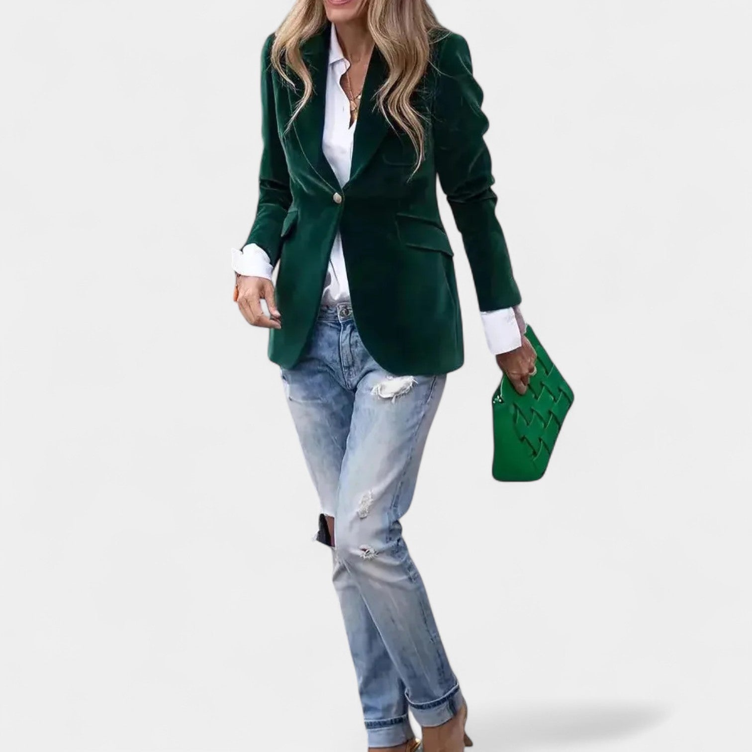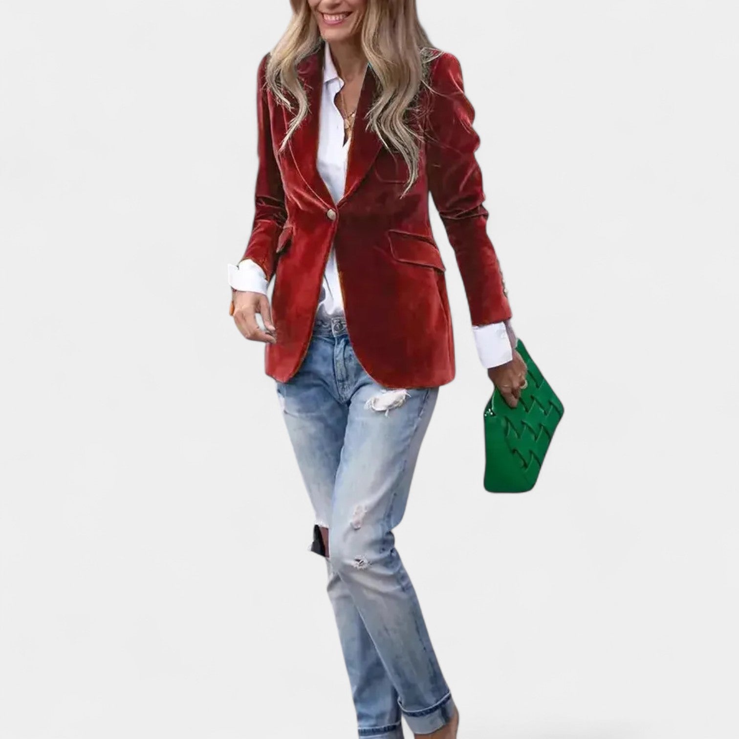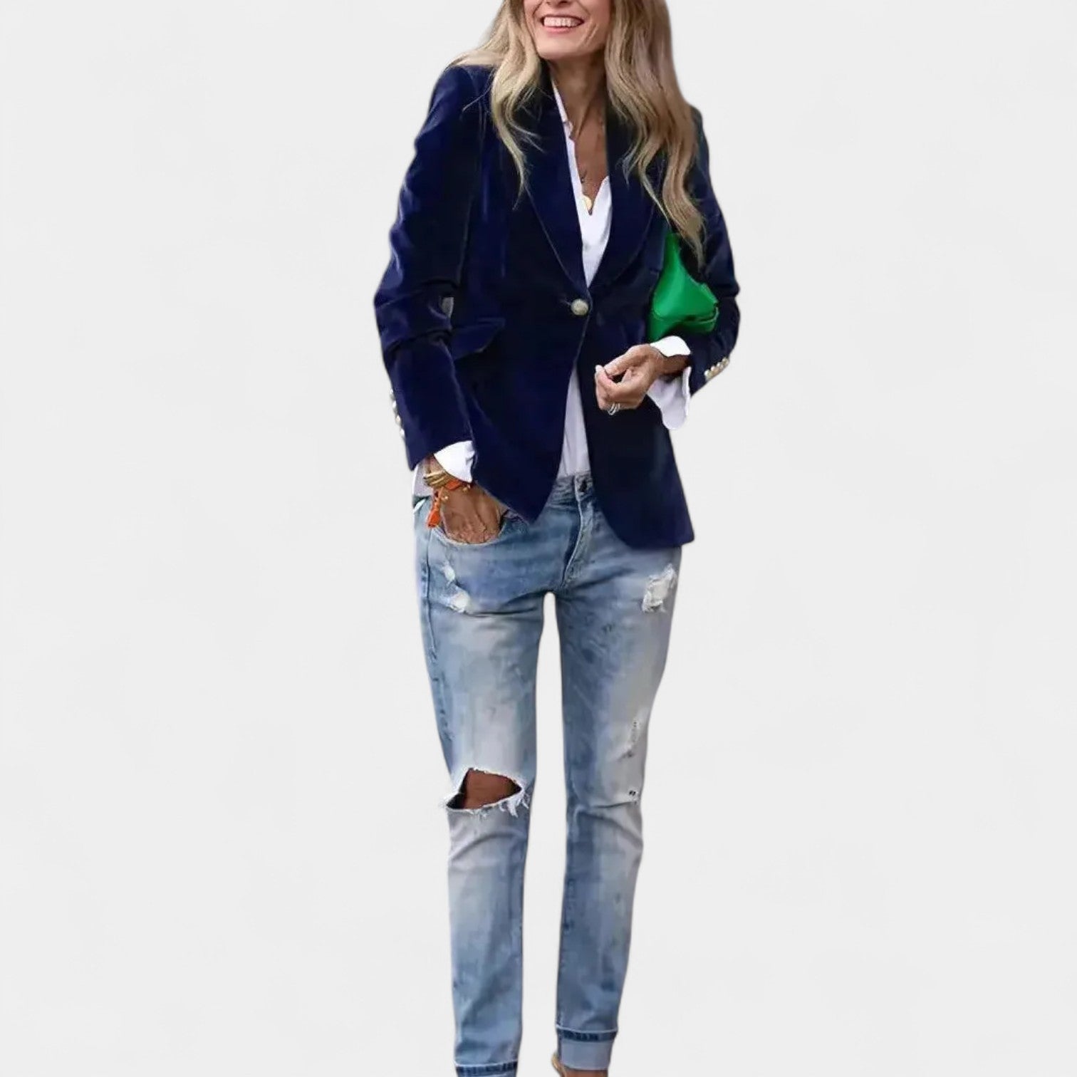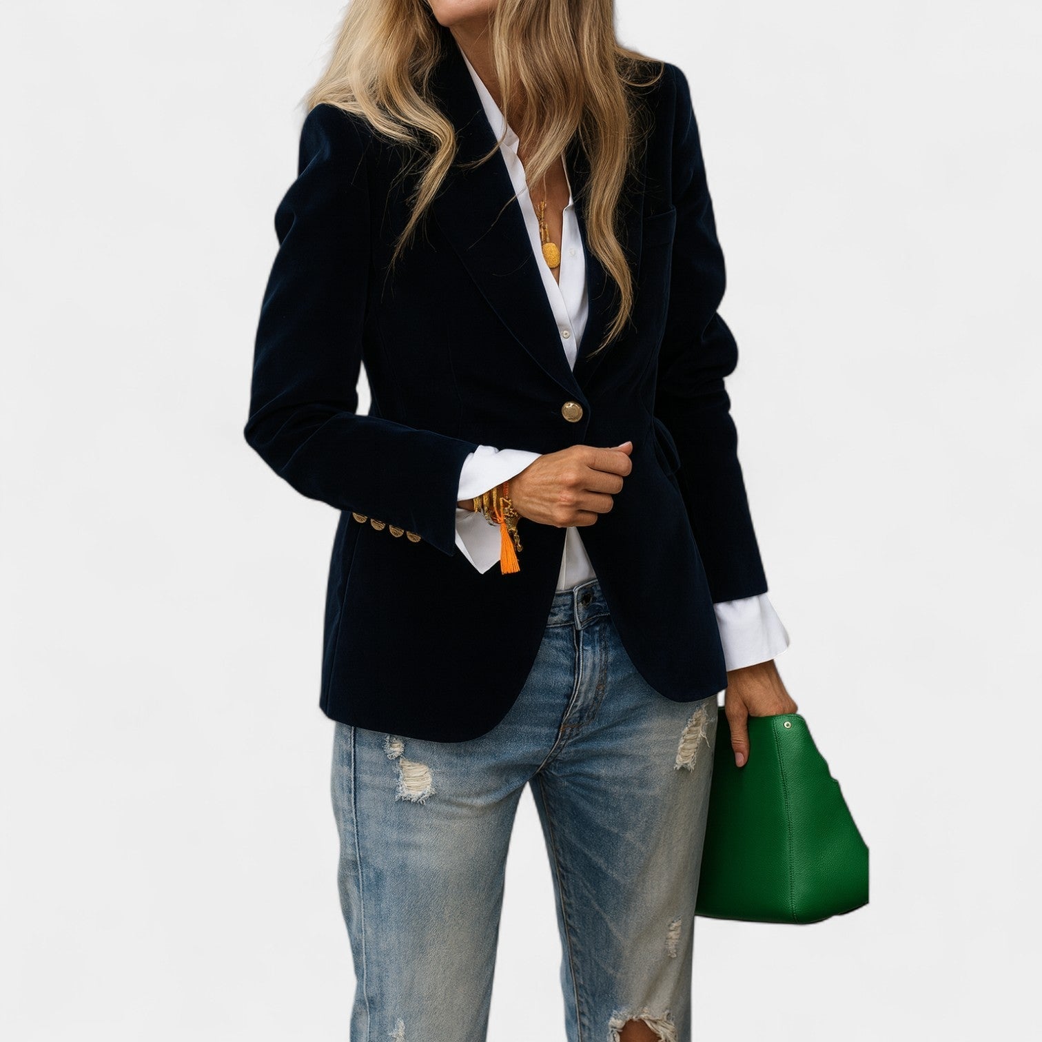 Jaka Andrea ar mīkstu samta virsmu ir ideāls apģērbs sievietēm, kuras vēlas izskatīties eleganti un pārliecināti jebkurā situācijā. Pateicoties precīzajai piegrieztei ar vienu pogu, asiem klapjiem un viegli polsterētām plecu daļām, tā veido glaimojošu siluetu, kas der gan džinsiem, gan elegantiem tērpiem. Zelta pogas uz piedurknēm piešķir sofistiskētu akcentu.