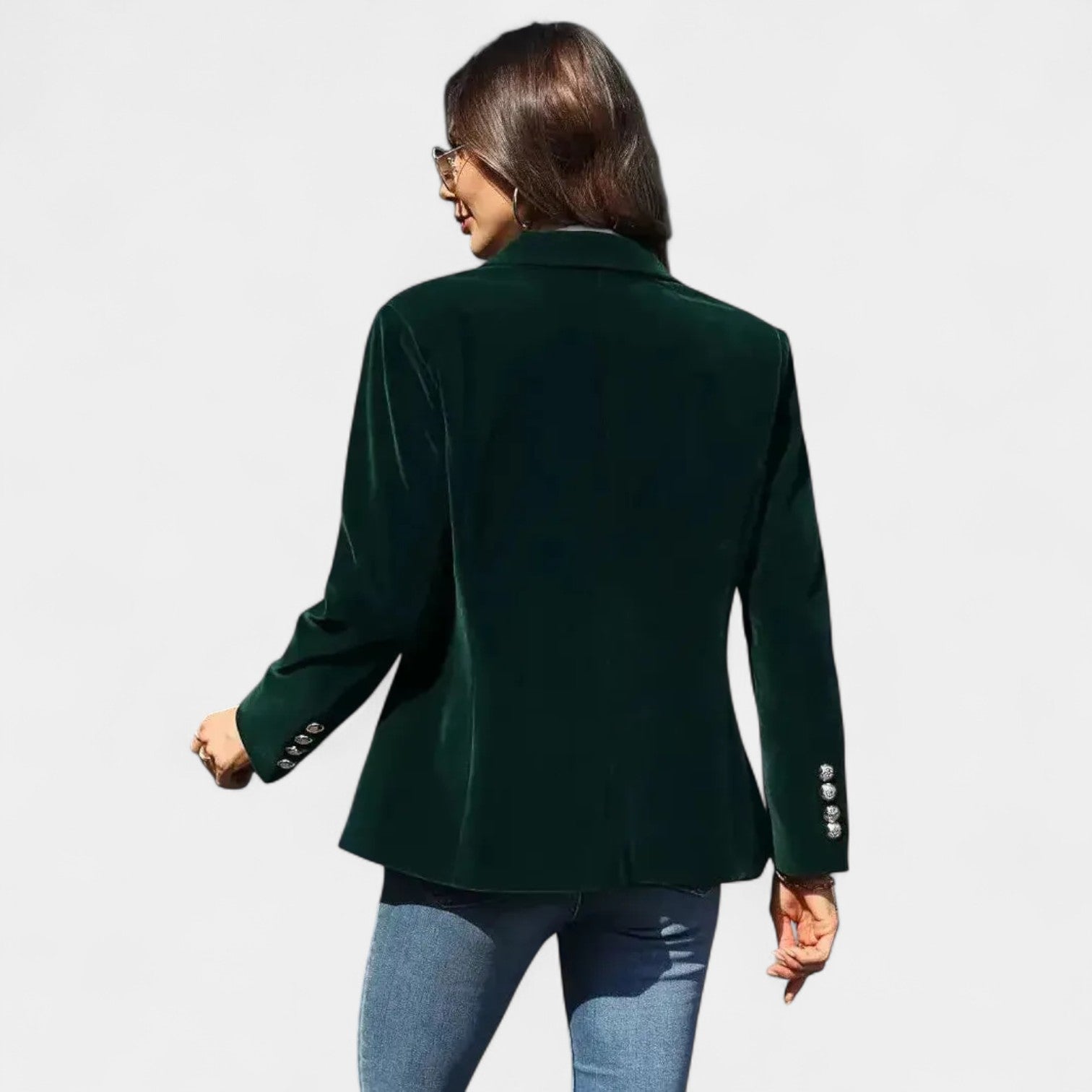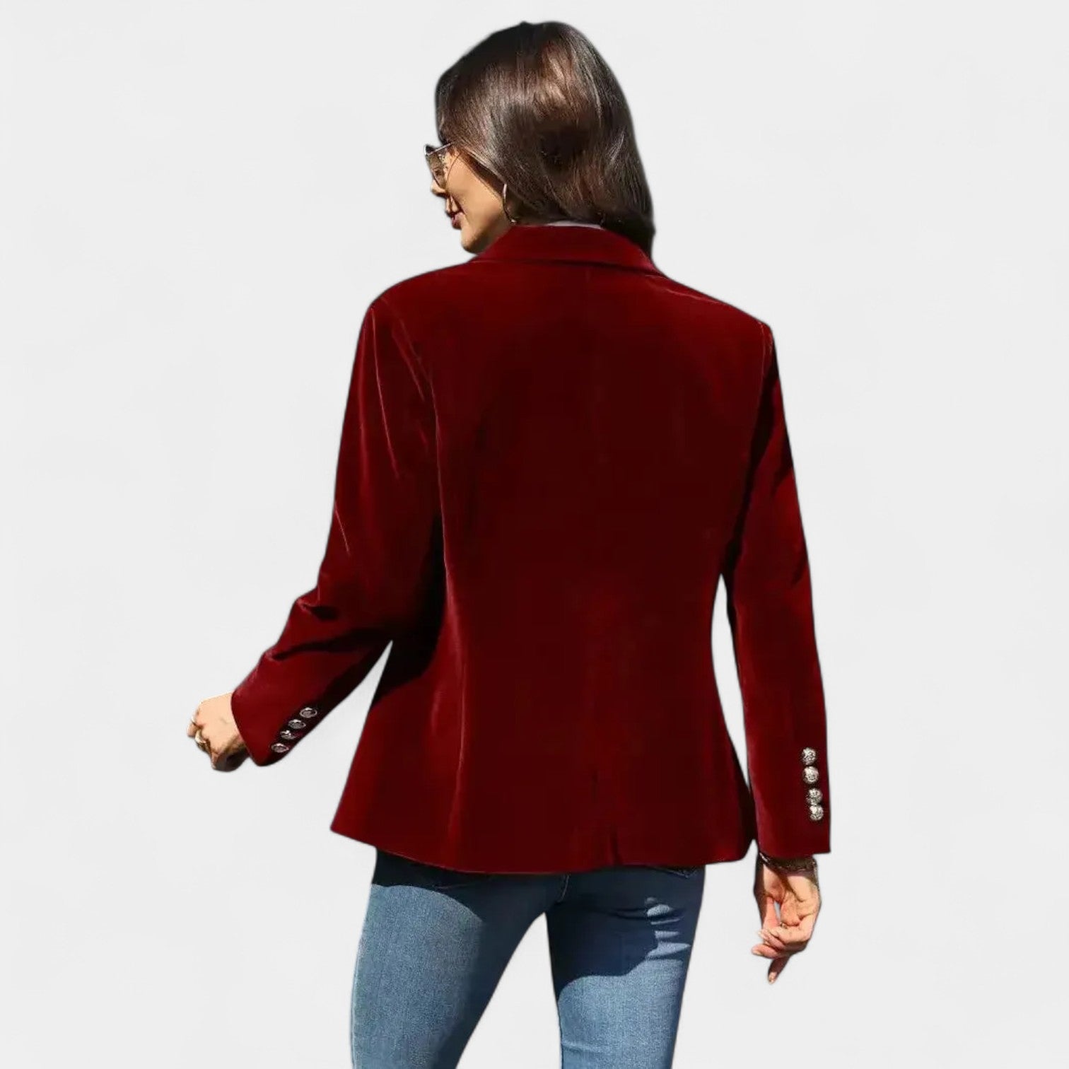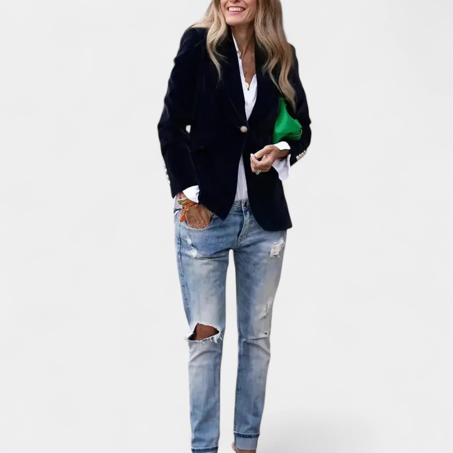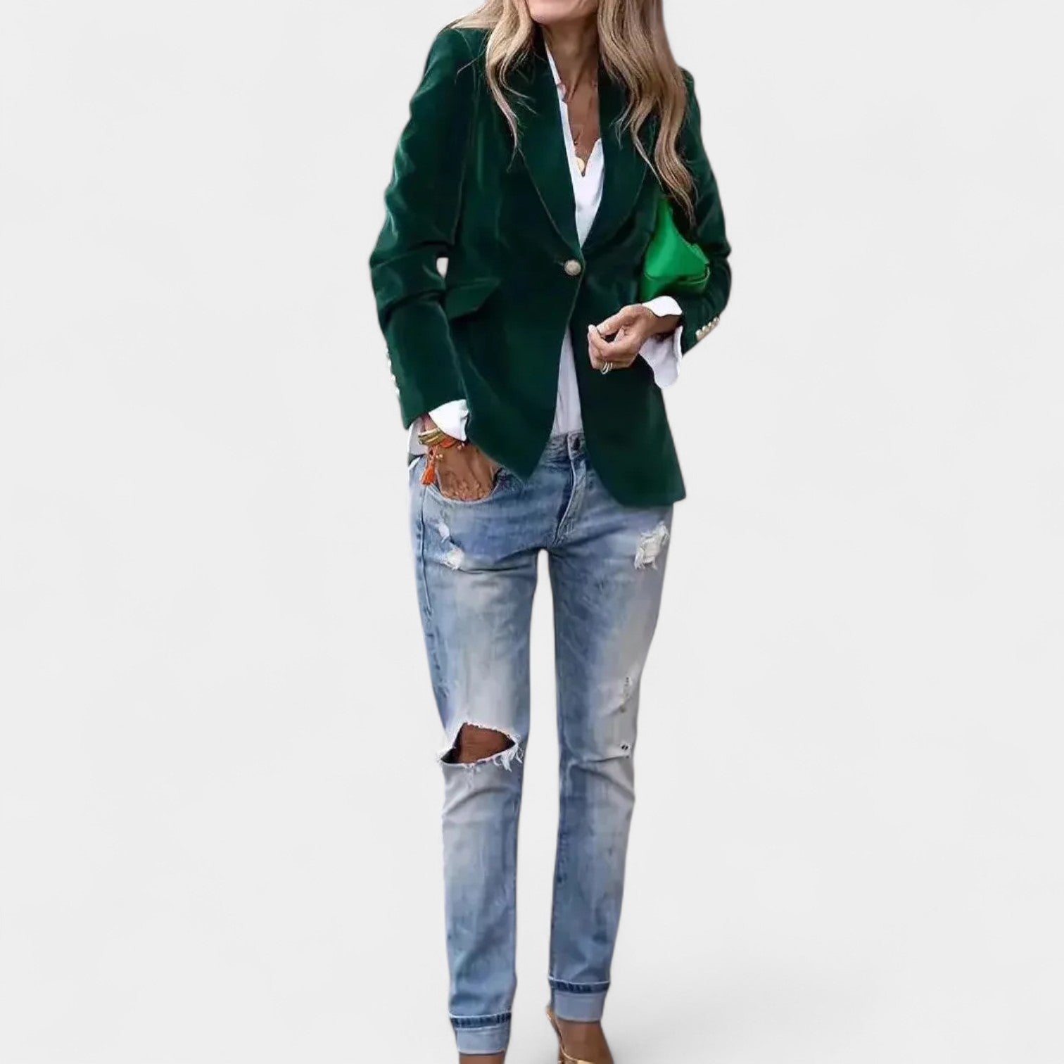Jaka Andrea ar mīkstu samta virsmu ir ideāls apģērbs sievietēm, kuras vēlas izskatīties eleganti un pārliecināti jebkurā situācijā. Pateicoties precīzajai piegrieztei ar vienu pogu, asiem klapjiem un viegli polsterētām plecu daļām, tā veido glaimojošu siluetu, kas der gan džinsiem, gan elegantiem tērpiem. Zelta pogas uz piedurknēm piešķir sofistiskētu akcentu.