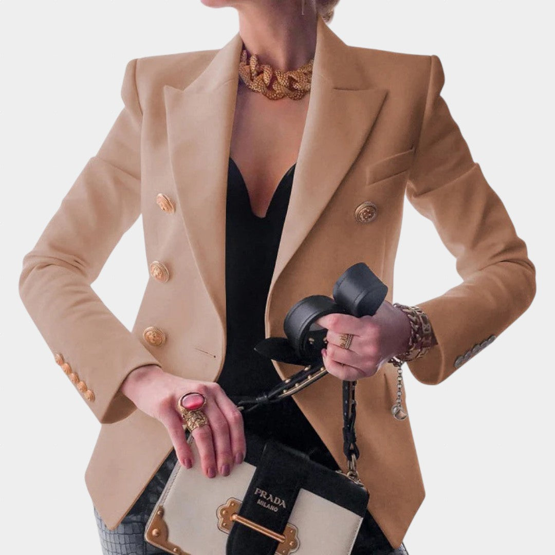 Paaugstini savu garderobi ar Laimu, klasisko žaketi, kur izteiksmīgs piegriezums un koši zelta pogu akcenti saplūst nevainojamā harmonijā. Radīta, lai izceltu tavu siluetu un izstarotu pārliecību, šī žakete nemanāmi pāriet no profesionālas dienas vides uz vakara eleganci.
