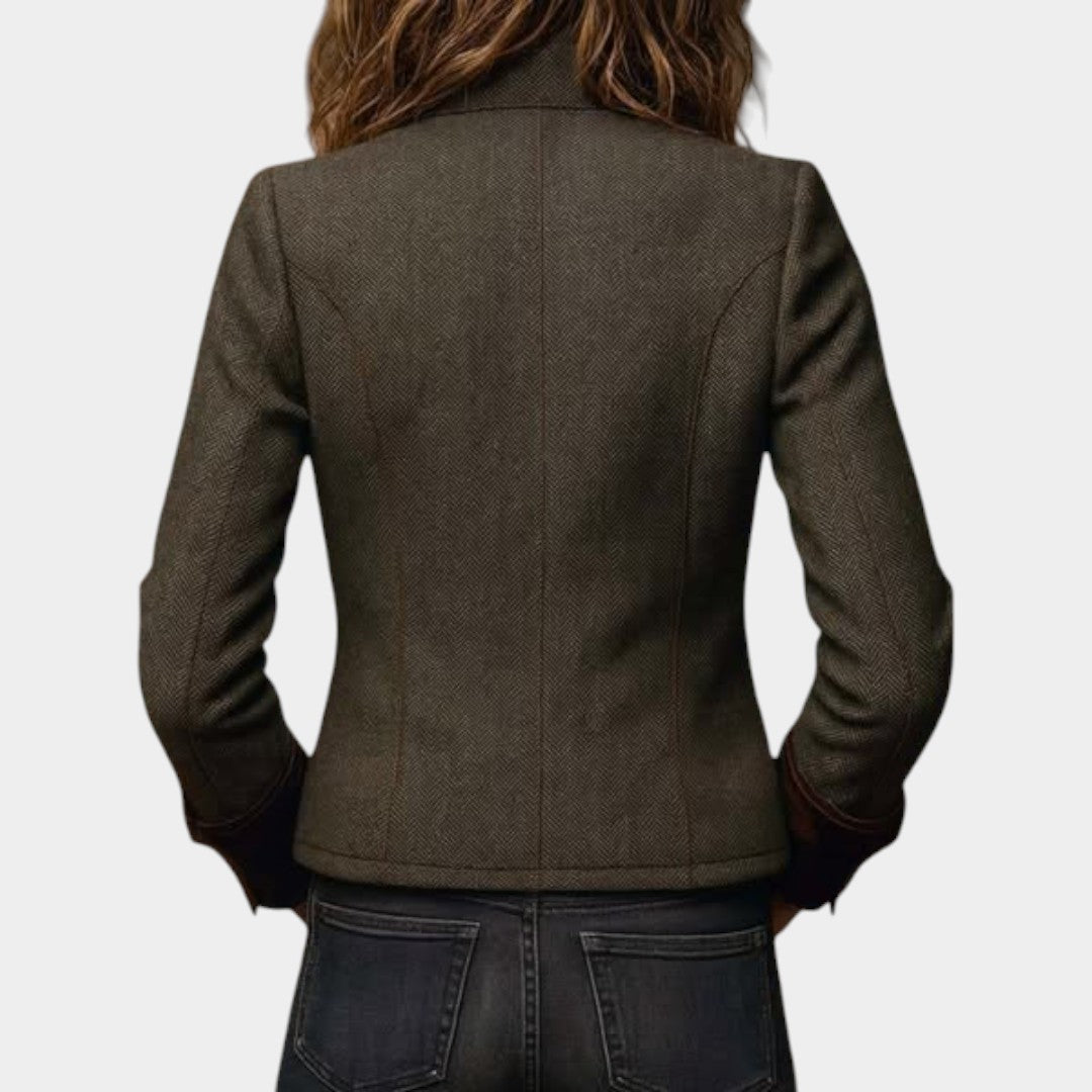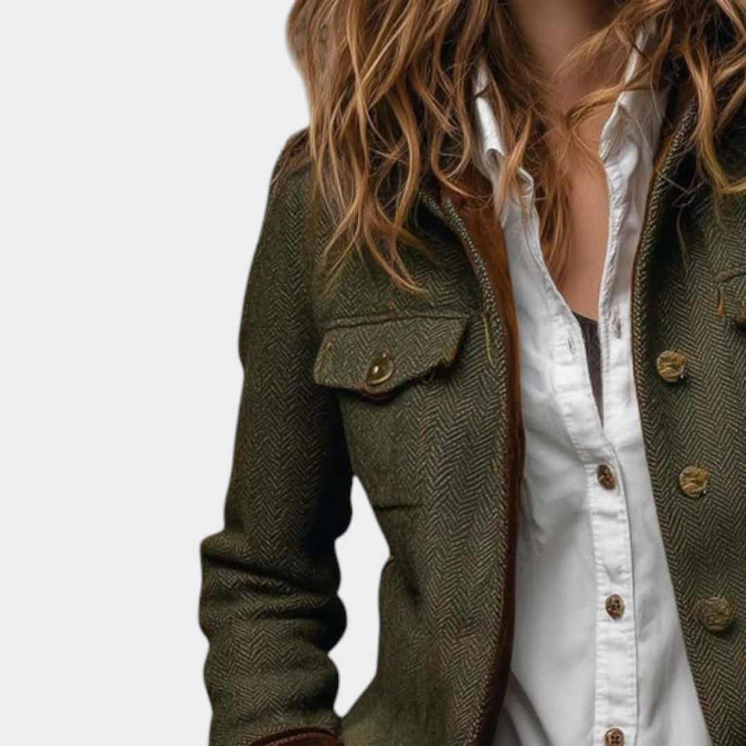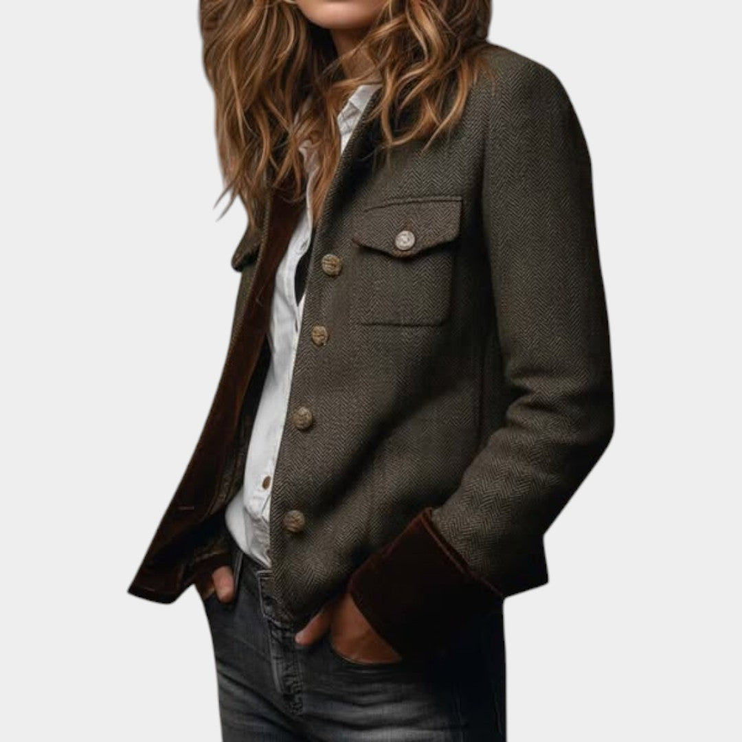 Ienāciet laika pārbaudītā elegancē ar Līgas pielāgoto zvejas raksta žaketi. Izgatavota no augstas kvalitātes auduma dziļā olīvu tonī, tā apvieno klasisku šarmu ar mūsdienīgu piegriezumu. Samta apdare, metāla pogas un strukturēta forma piešķir žaketei izsmalcinātu, sievišķīgu siluetu.