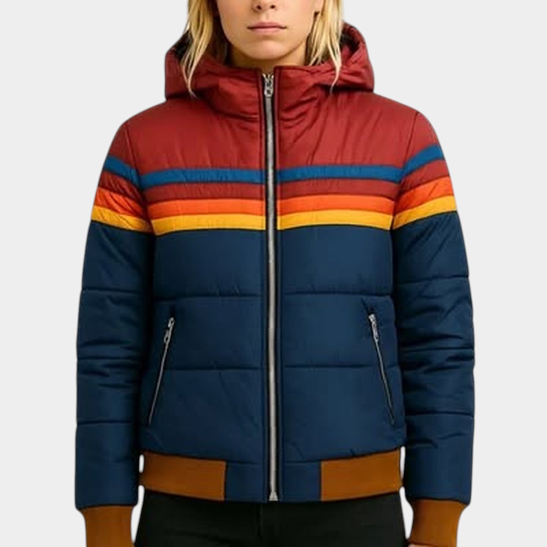 Paula jaka apvieno retro sporta šarmu ar mūsdienīgu komfortu. Pateicoties siltumizolācijai un mīkstajai oderējuma struktūrai, tā uztur patīkamu siltumu pat aukstās dienās, kamēr praktiskā kapuce nodrošina papildu aizsardzību pret vēju un aukstumu. Krāsainās svītras kontrastējošos toņos piešķir šim modelim enerģisku, pārliecinošu raksturu.