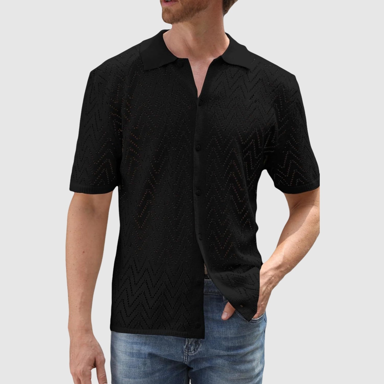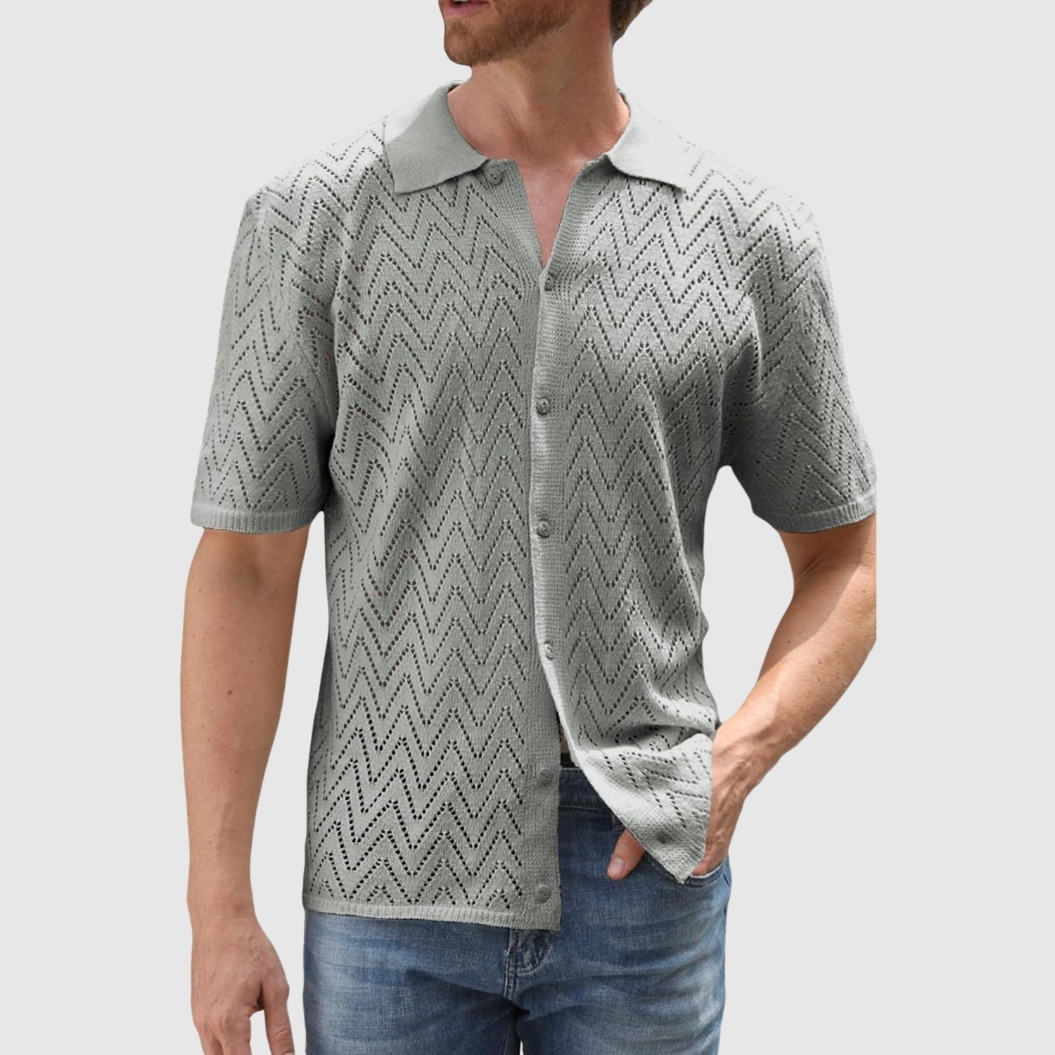 Uzdrīksties iziet ar izskatu, kas apvieno svaigumu, tekstūru un mūsdienīgu dizainu. Šis adītais krekls ar zigzaga rakstu sniedz sofistiscētu un mūsdienīgu izskatu, neupurējot komfortu. Ideāli piemērots, lai izceltos neformālās situācijās vai vasaras pasākumos, pateicoties vieglajam un elpojošajam materiālam.