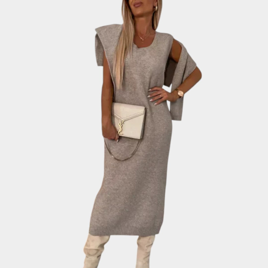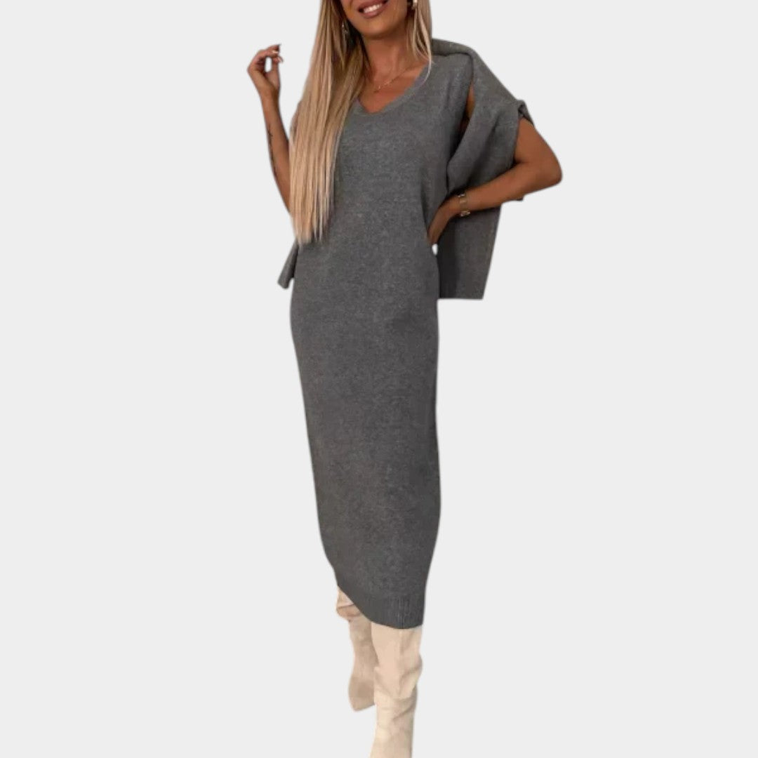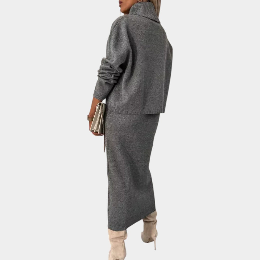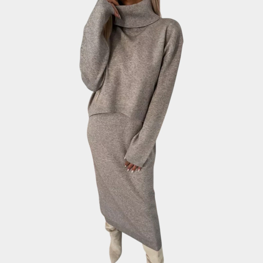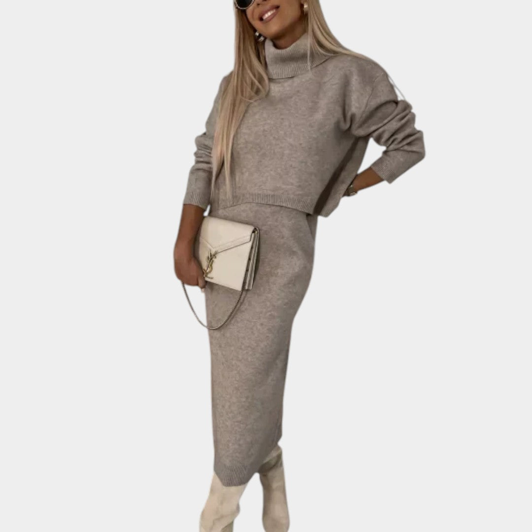 Sofie ir elegants divi vienā komplekts, kas apvieno mīksto augsto apkakli un pieguļošu adītu kleitu vienā dizainā. Siltā materiāla dēļ komplekts ir ideāls rudenim, kad komforts un stils iet roku rokā. Ideāli piemērots gan ikdienai, gan vakaram, kad vēlaties izsmalcinātu izskatu ar maksimālu kustību brīvību.