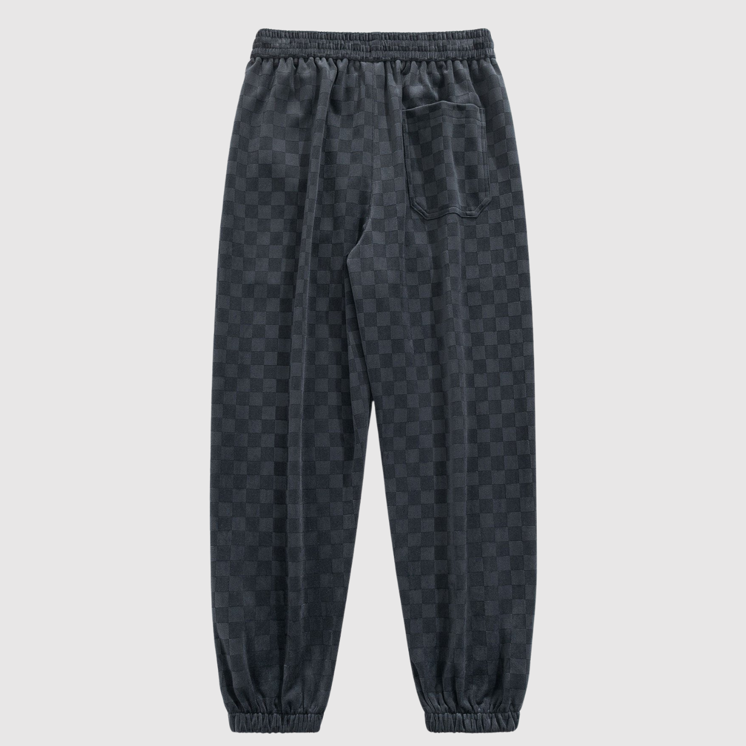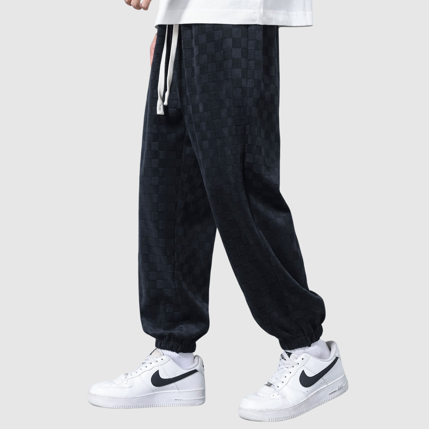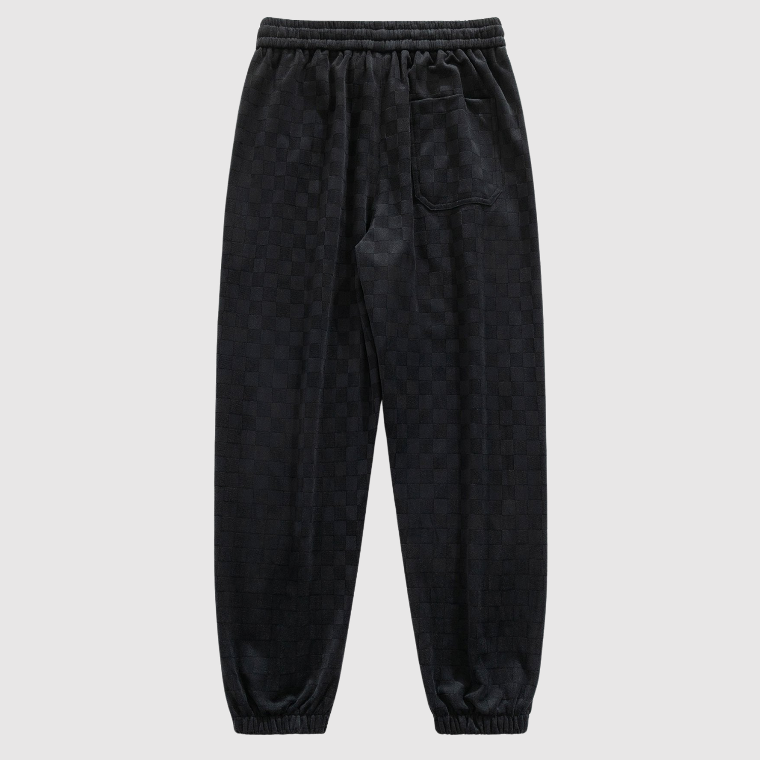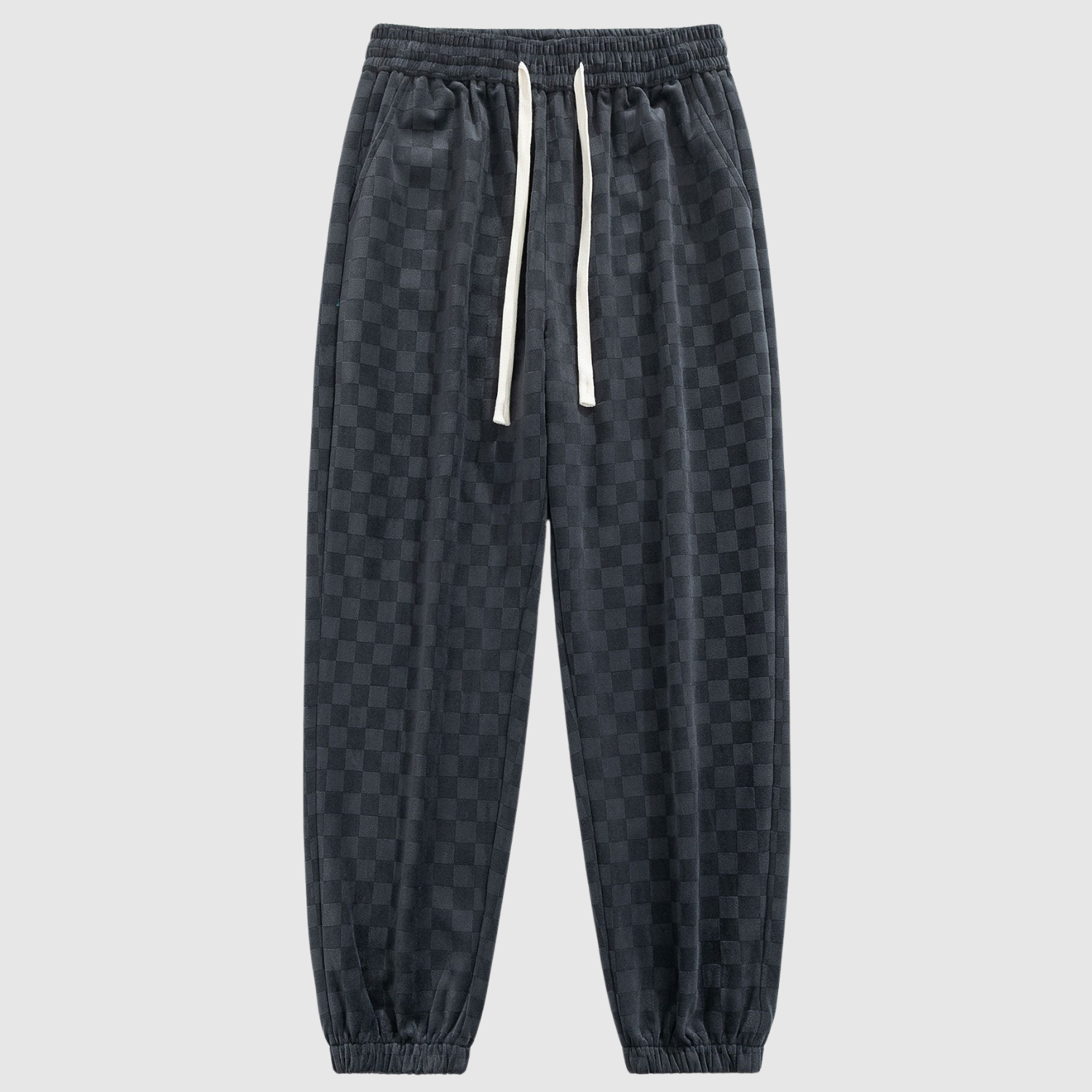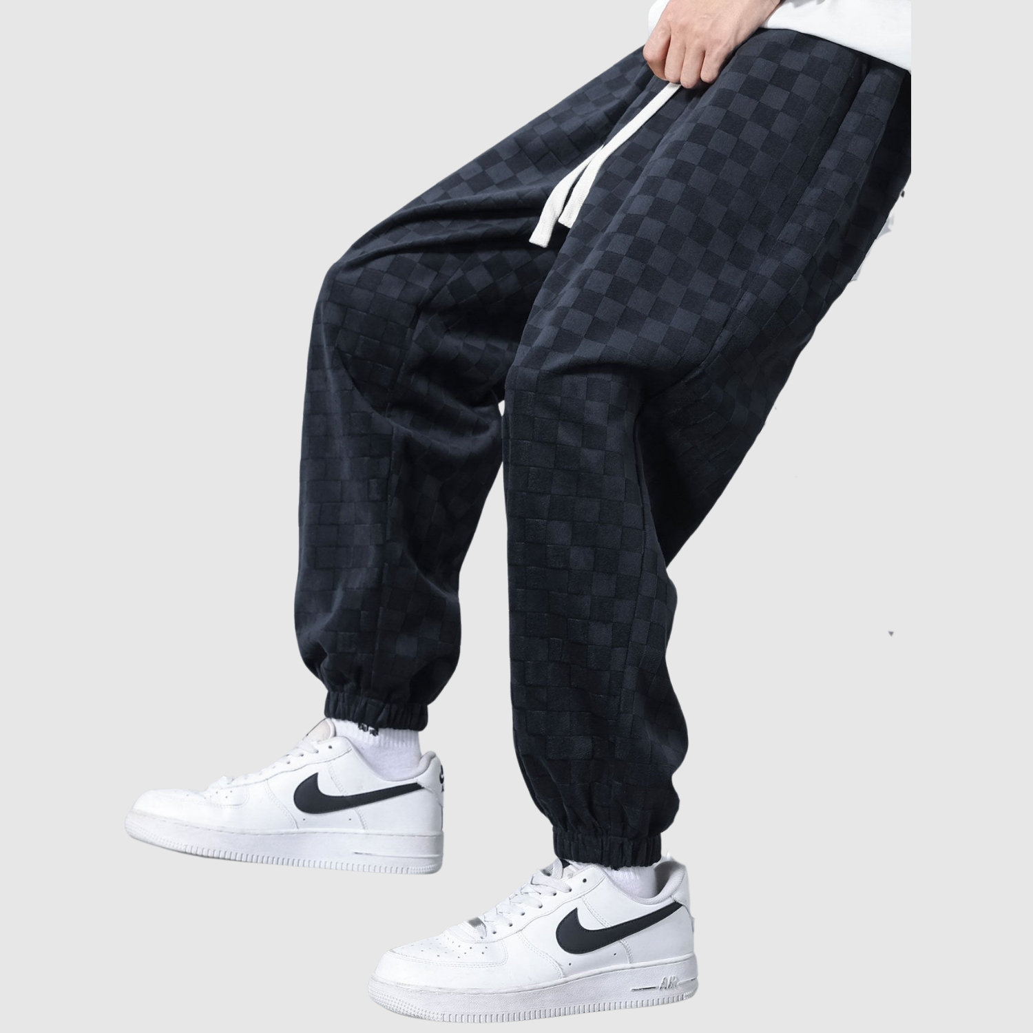 Šie joggeri izceļas ar savu diskrēto rūtaino rakstu, kas piešķir sofistiskētu pieskārienu citādi brīvai stilam. Ideāli ikdienas lietošanai un streetwear, ar elastīgu jostu un auklu maksimālam komfortam.