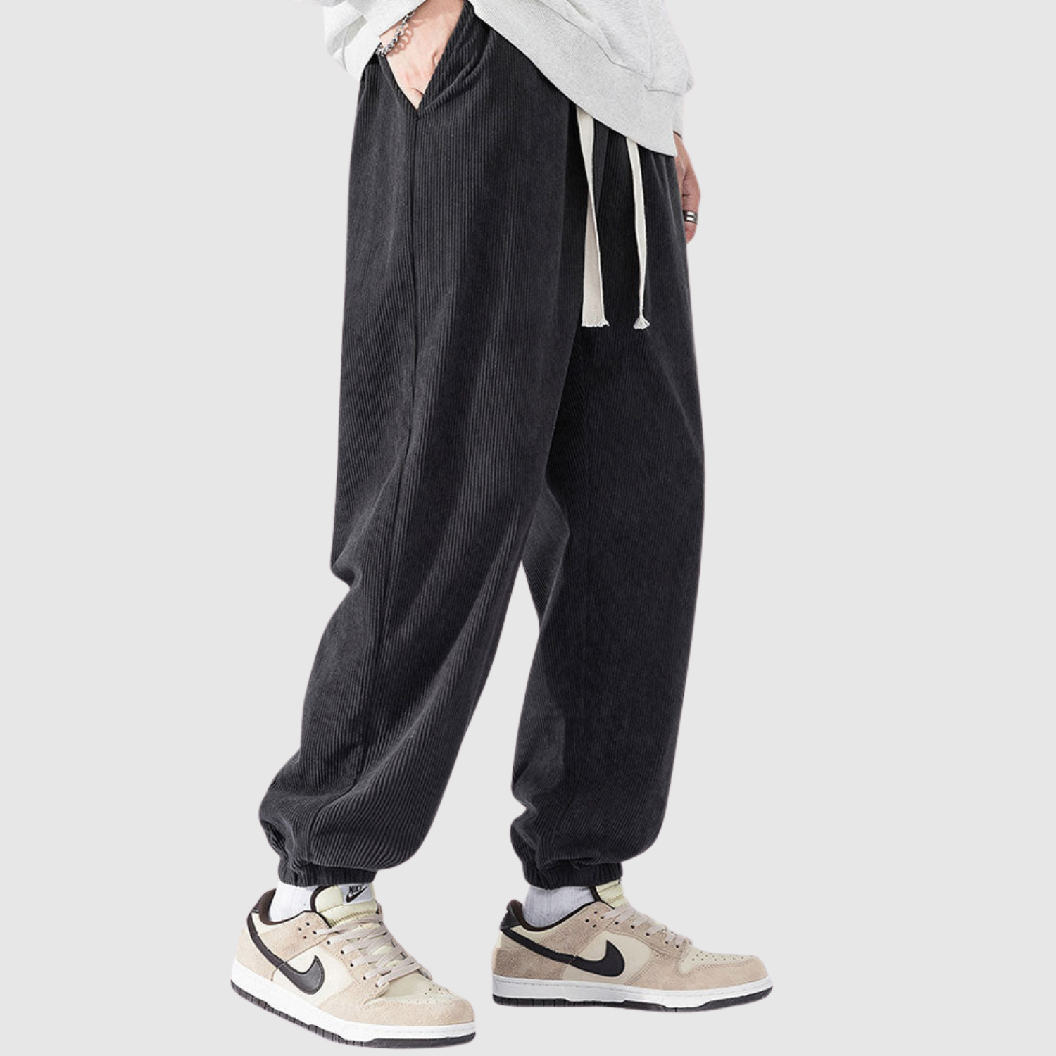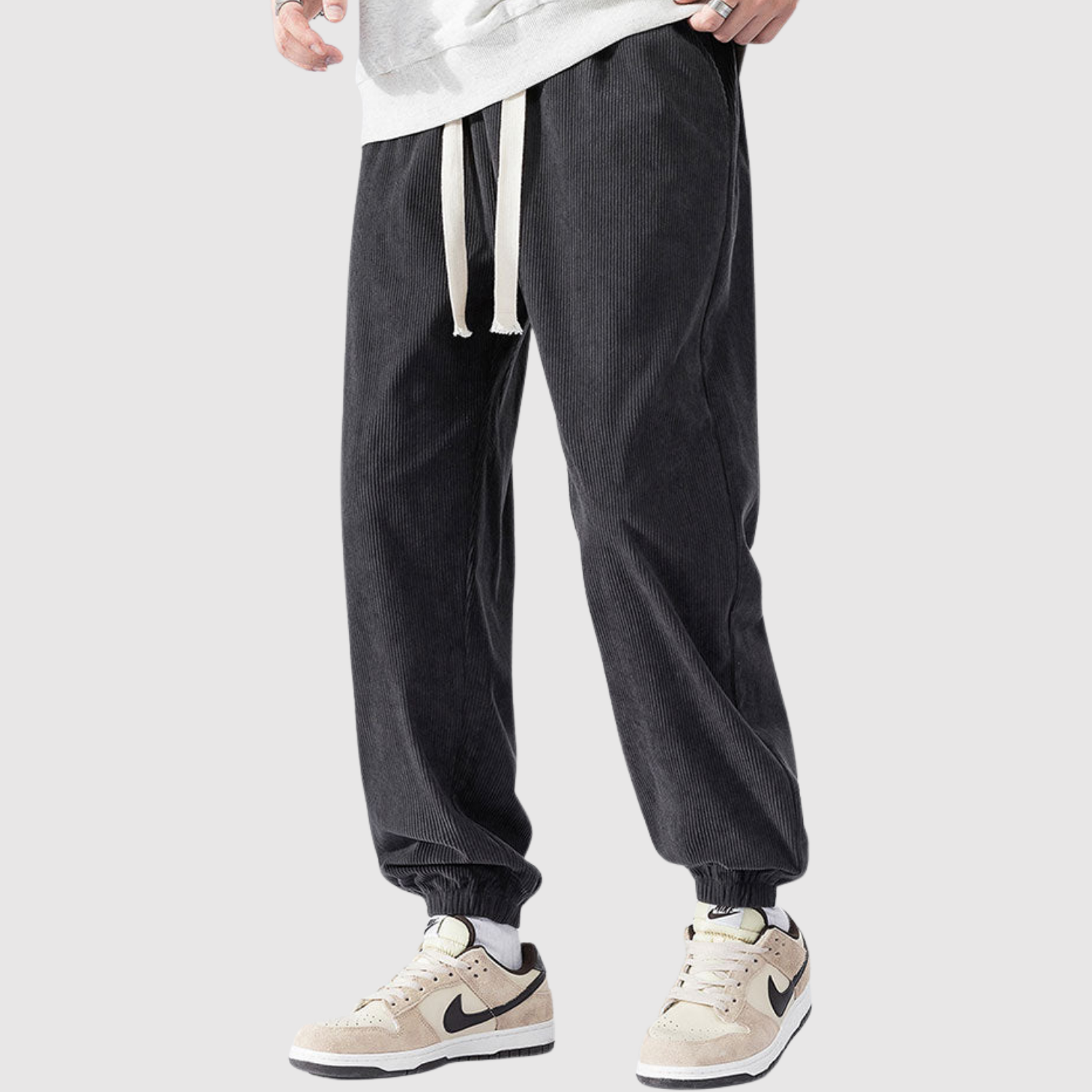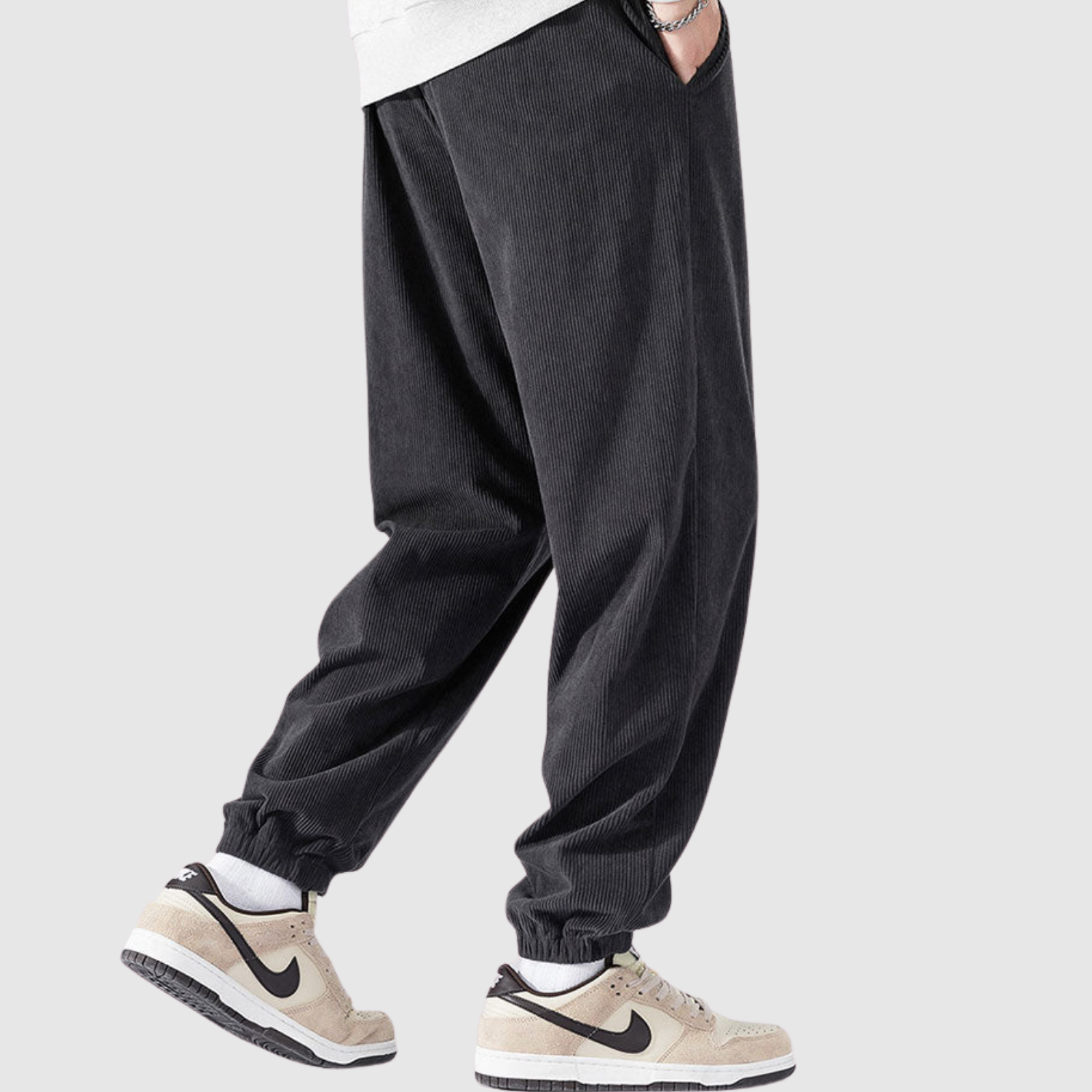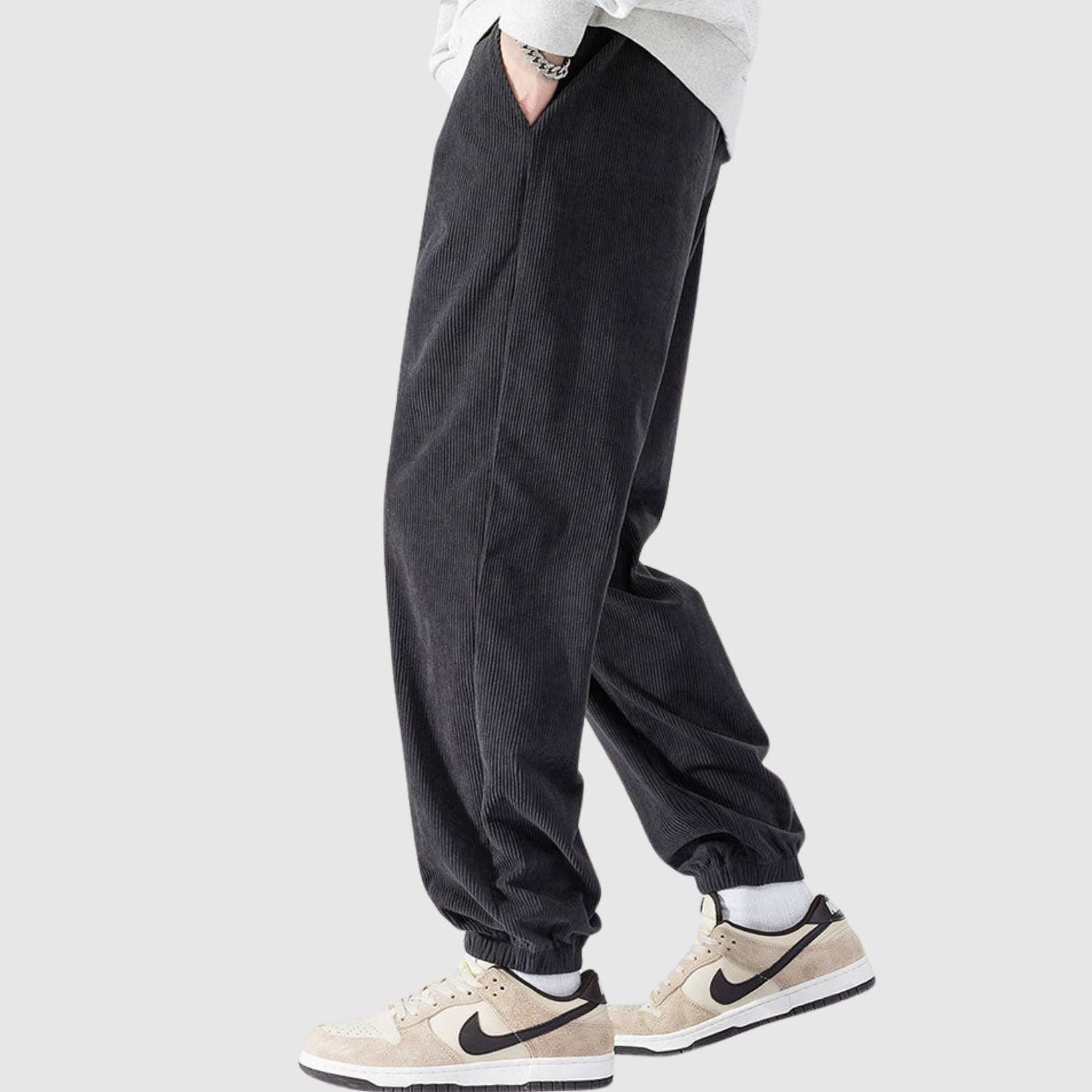 Šīs kargo bikses no samta apvieno modernu izskatu ar mīkstu tekstūru. Materiāls nodrošina gan komfortu, gan izturību, kamēr elastīgā josta garantē elastīgu piegriezumu ikdienas lietošanai.