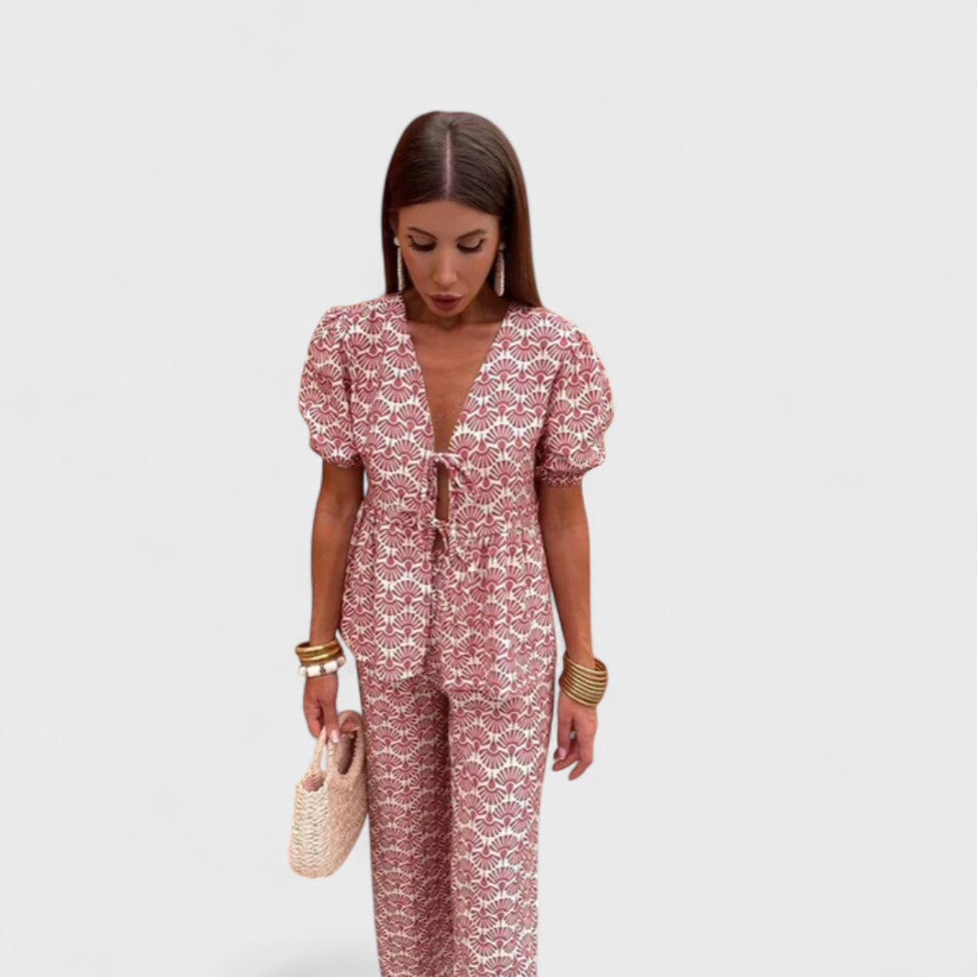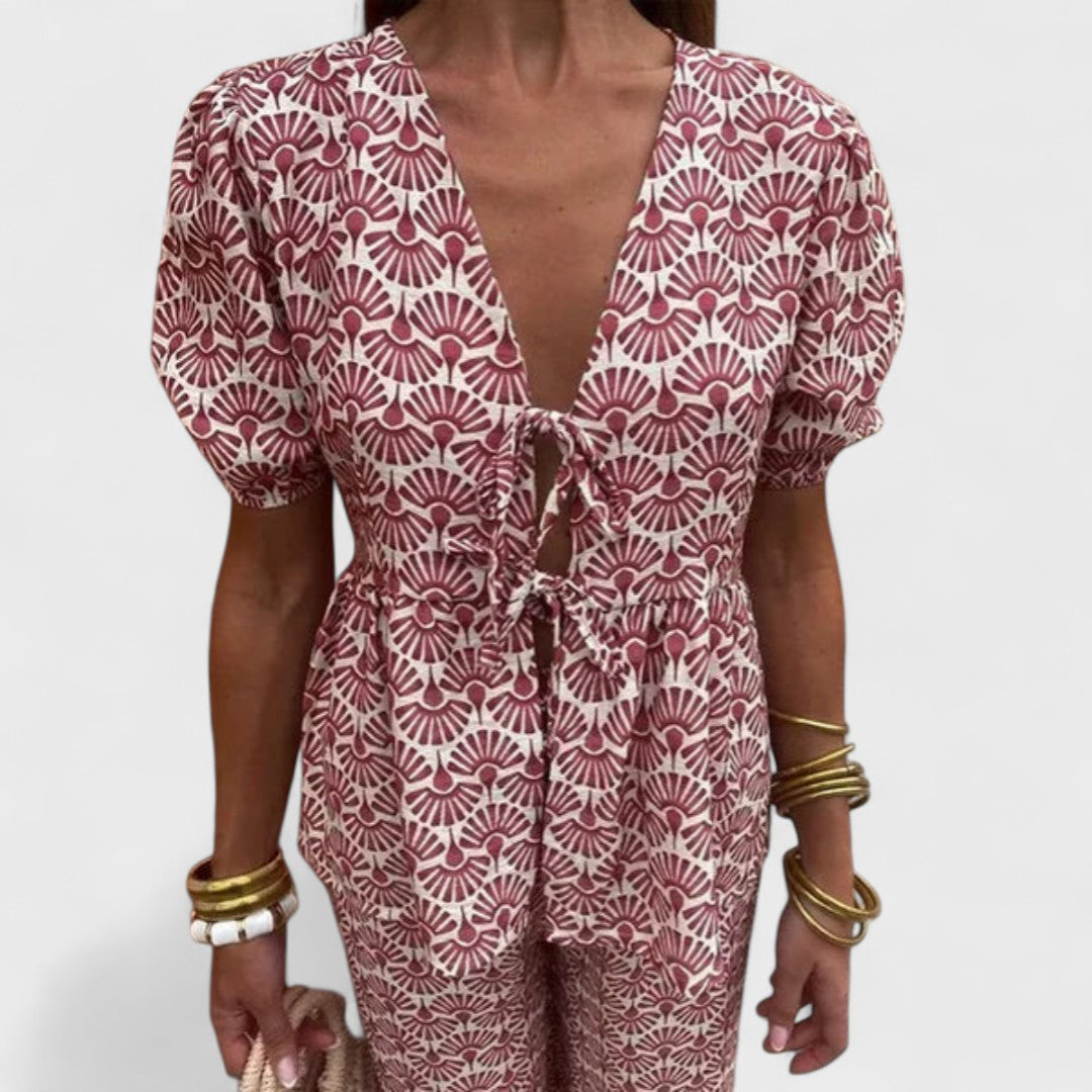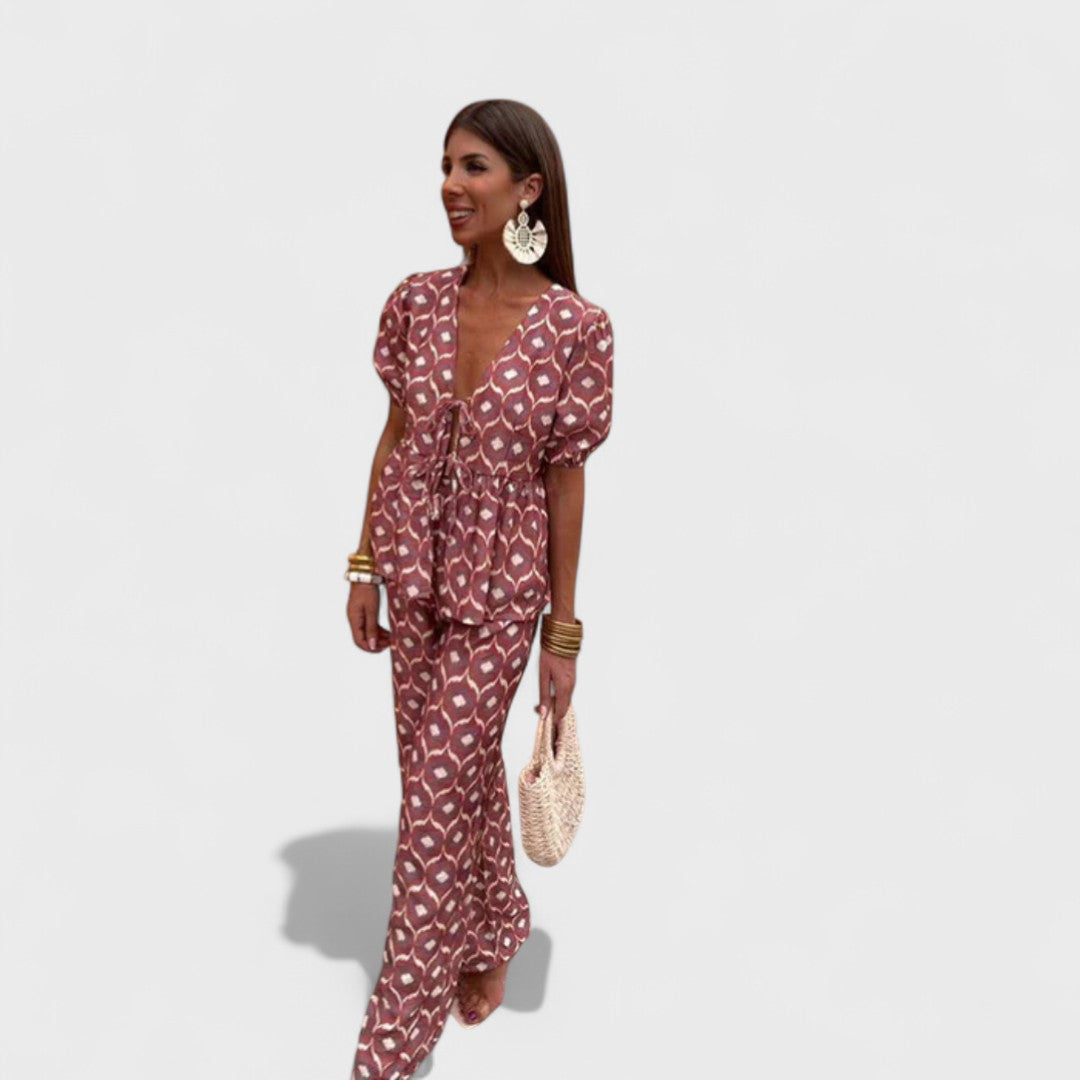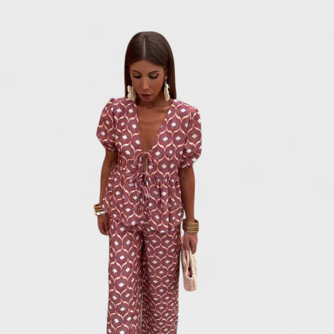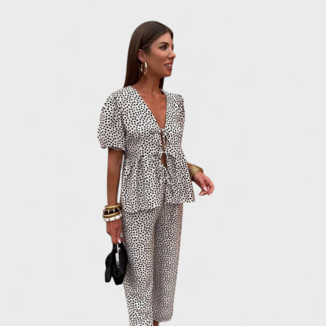 Mūsu populārais Gracia komplekts ir ideāla sievišķības, komforta un stila kombinācija, kas ir lieliski piemērota siltām vasaras dienām. Šis komplekts sastāv no plūstošas blūzes ar īsām piedurknēm un atbilstošām vieglām biksēm, kas rada harmonisku, sievišķīgu un viegli valkājamu izskatu. Šis apģērbs ir izstrādāts, lai tu varētu starot dienu pēc dienas.