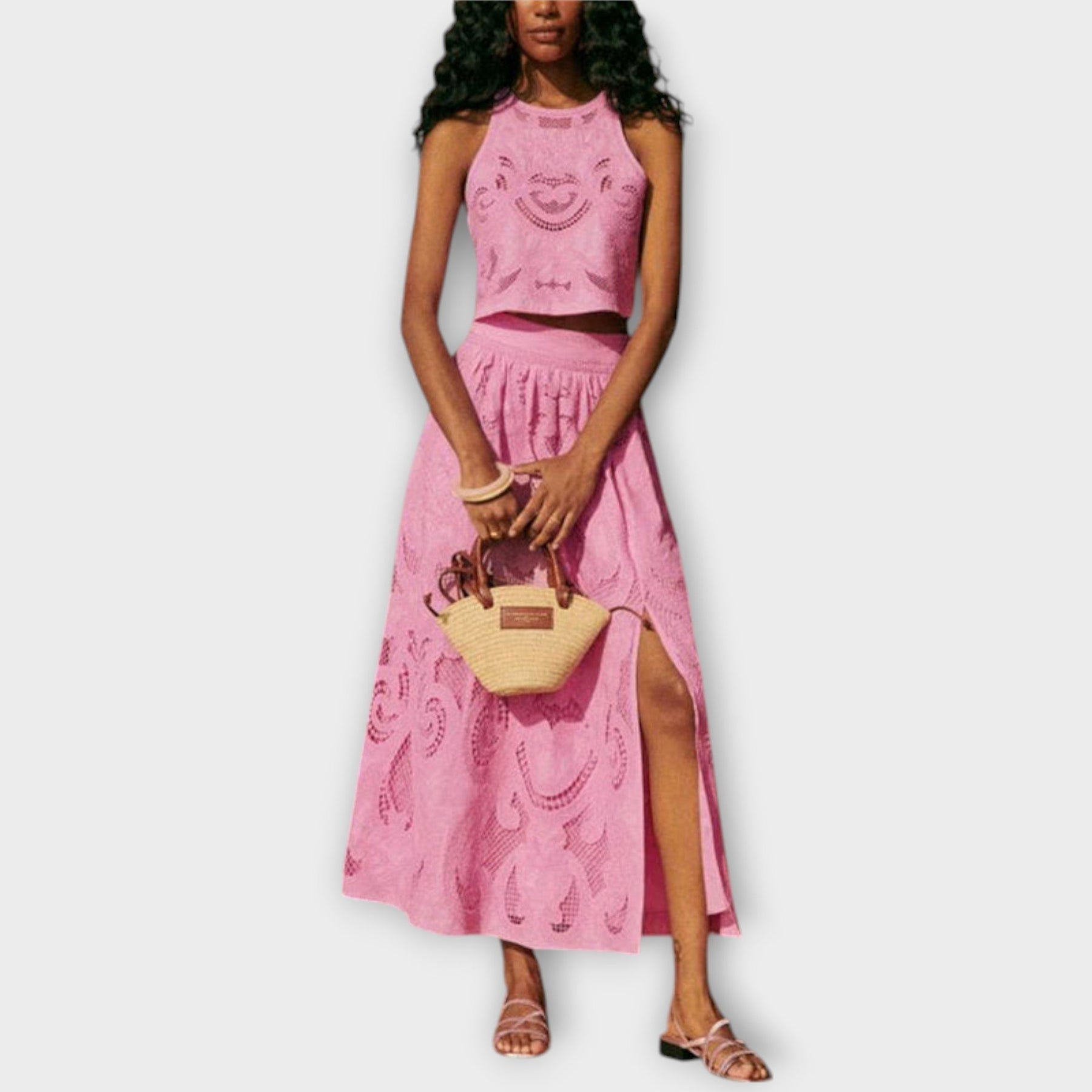 Šī skaistā maxi kleita līdz potītēm ir meistarīgi izgatavota no luksusa mežģīnēm ar izgriezumu un augstas kvalitātes britu kokvilnas, kas nodrošina gan stilu, gan komfortu. Ideāli piemērota brīvdienām vai svinībām, tā piedāvā elegantu, brīvu piegriezumu, kas izceļ jebkuru figūru.