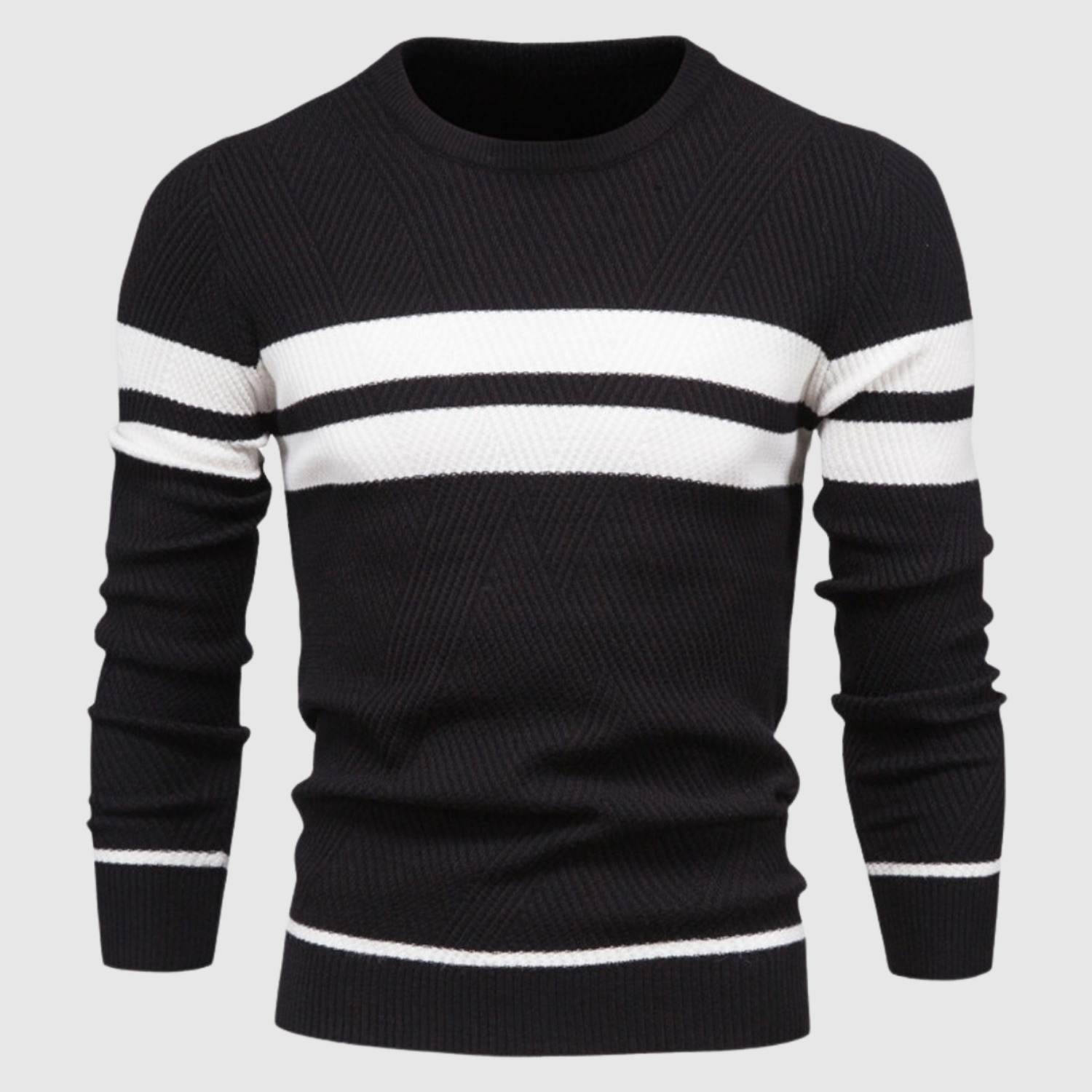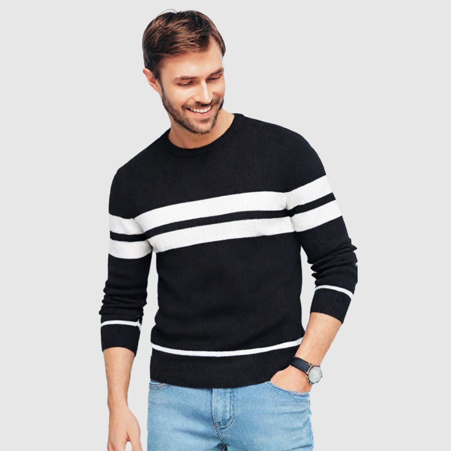 Mūžīgs džemperis ar dubultām horizontālām svītrām, kas piešķir sportisku un modernu izskatu. To ir patīkami valkāt ikdienā, bet tas ir pietiekami elegants, lai to izmantotu arī neformālās sanākšanās.