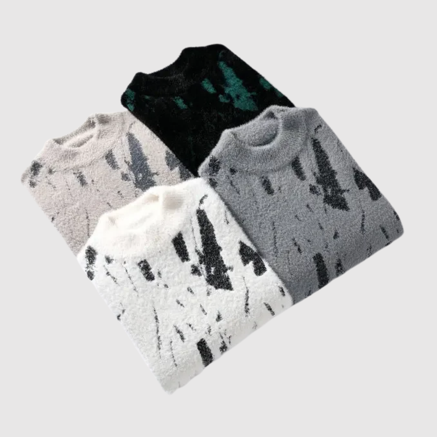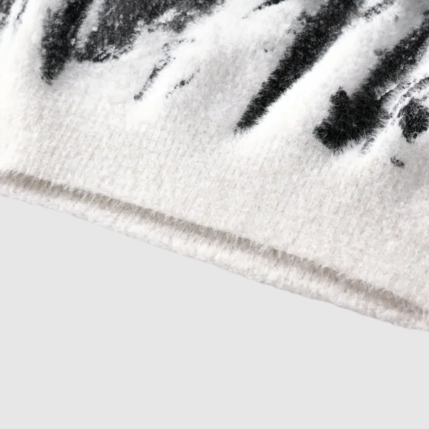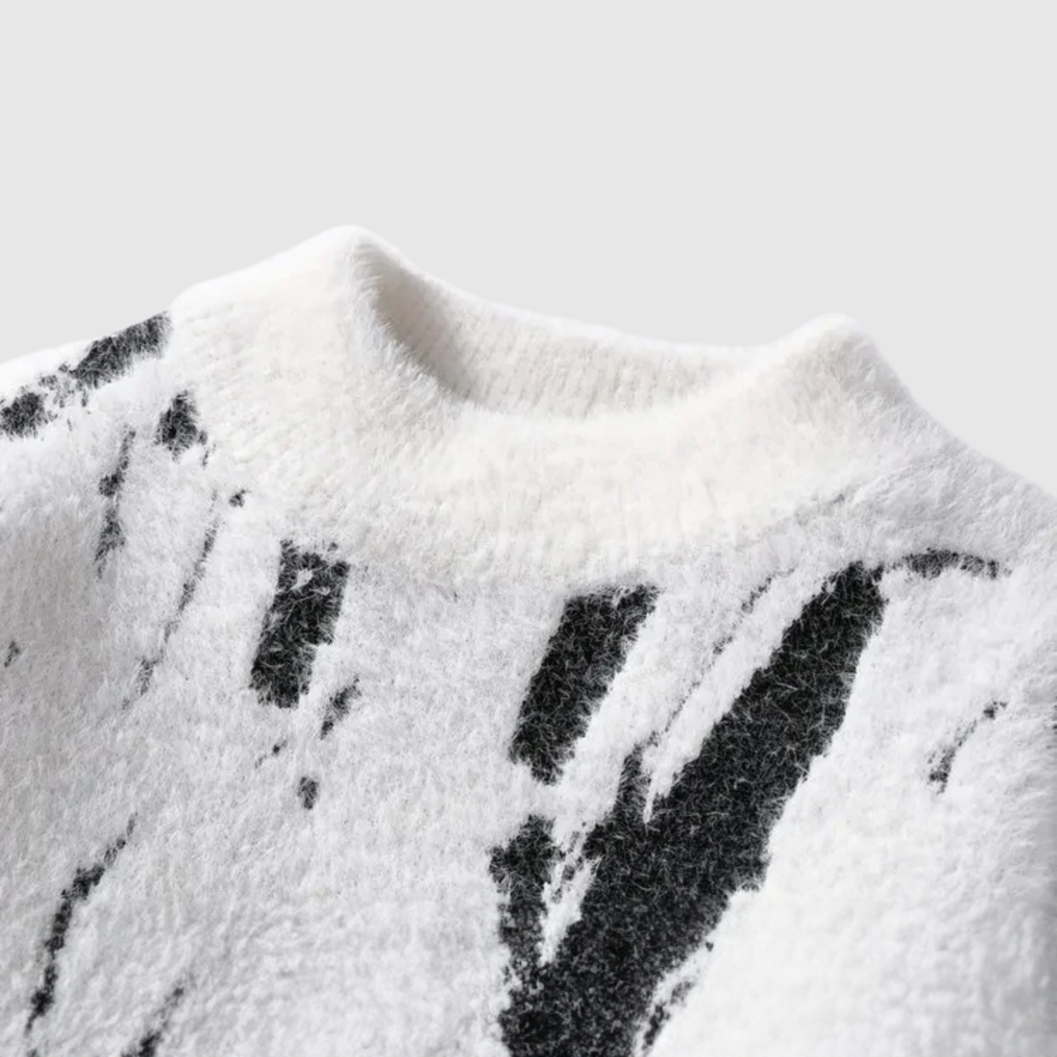 Mūsdienīgs un pamanāms adīts džemperis ar abstraktu rakstu, kas atgādina otas triepienus. Mīkstā kvalitāte nodrošina komfortu visu dienu, kamēr dizains piešķir unikālu māksliniecisku pieskārienu ziemas garderobei.