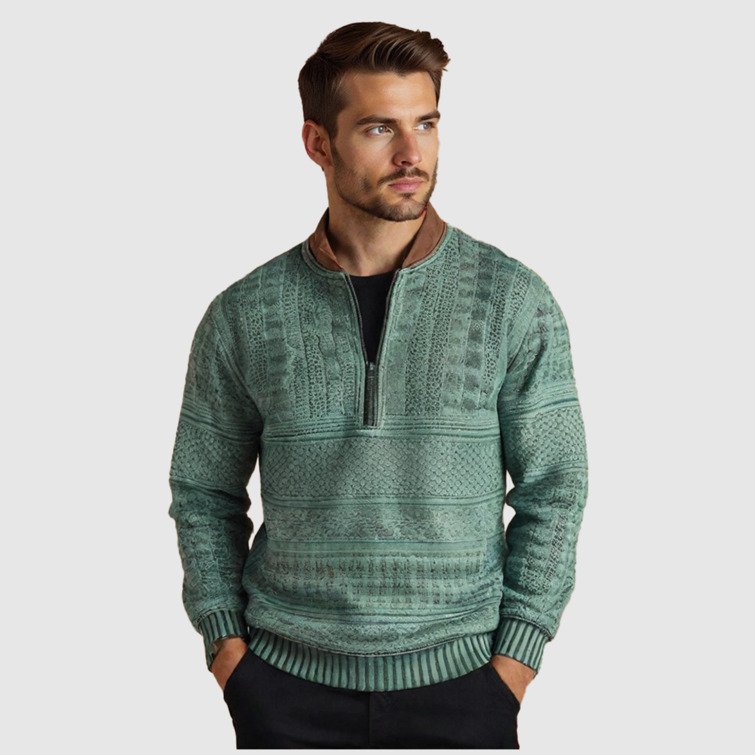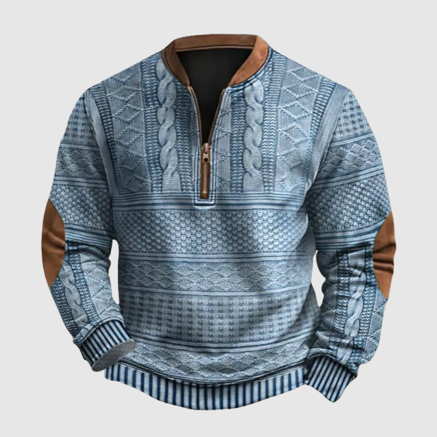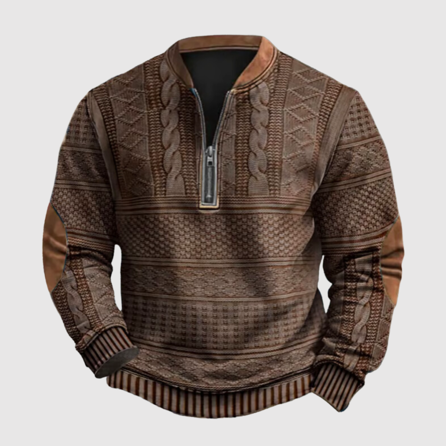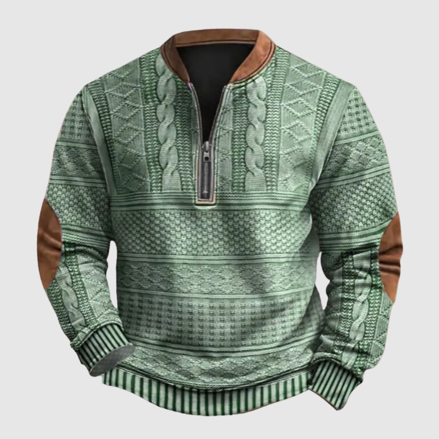 Silts un rakstains džemperis ar diskrētu rakstu un praktisku pus rāvējslēdzēju pie kakla. Ideāli piemērots aukstām dienām, kad vēlaties apvienot komfortu, funkcionalitāti un vīrišķīgu izskatu.