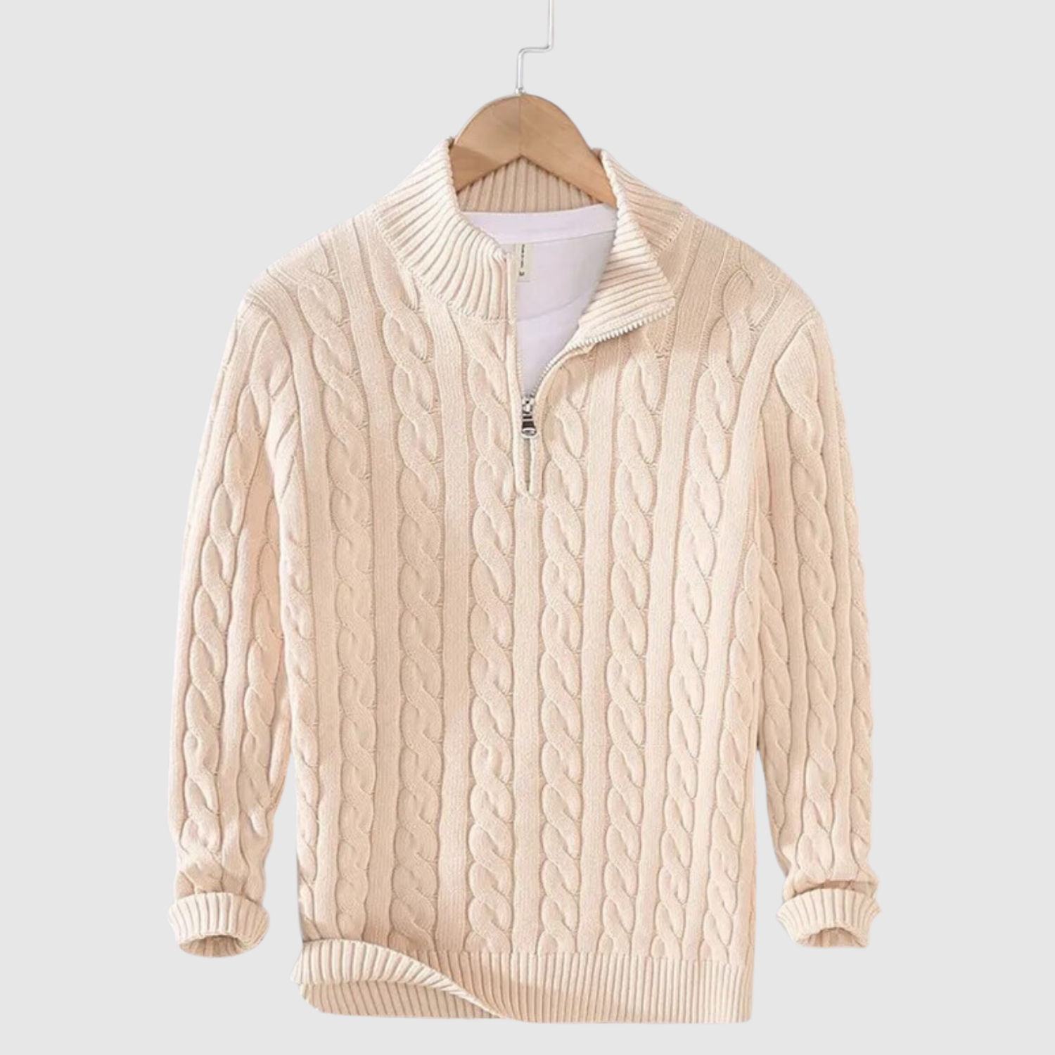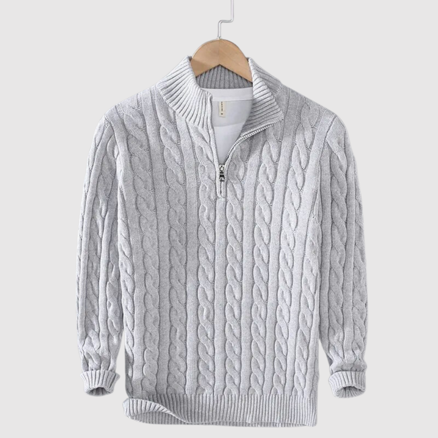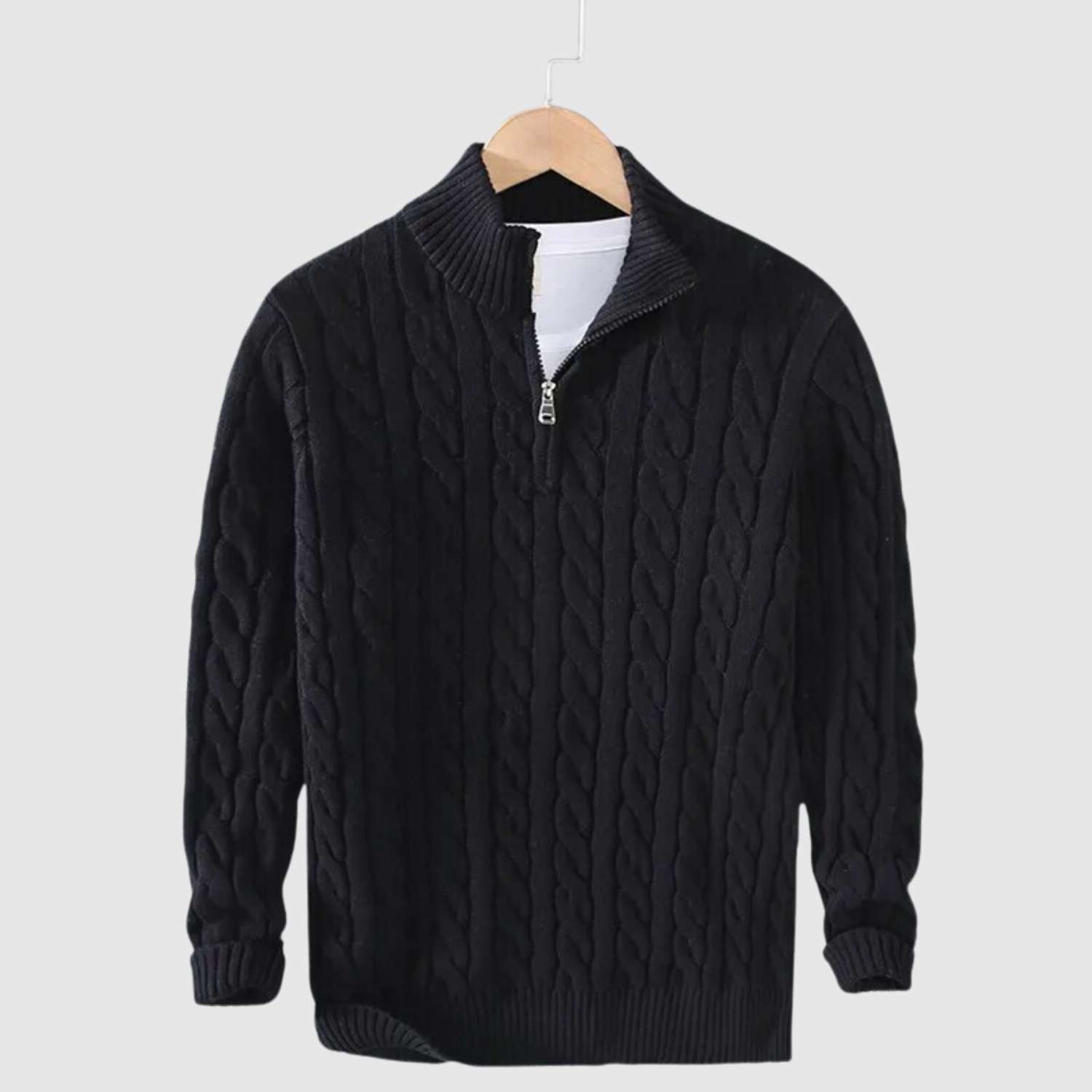 Klasisks džemperis ar modernu kabelu rakstu un rāvējslēdzēja apkakli, kas apvieno komfortu un stilu. Ideāli piemērots daudzslāņu izskatam vai atsevišķi kā stilīgs ikdienas izvēle.
