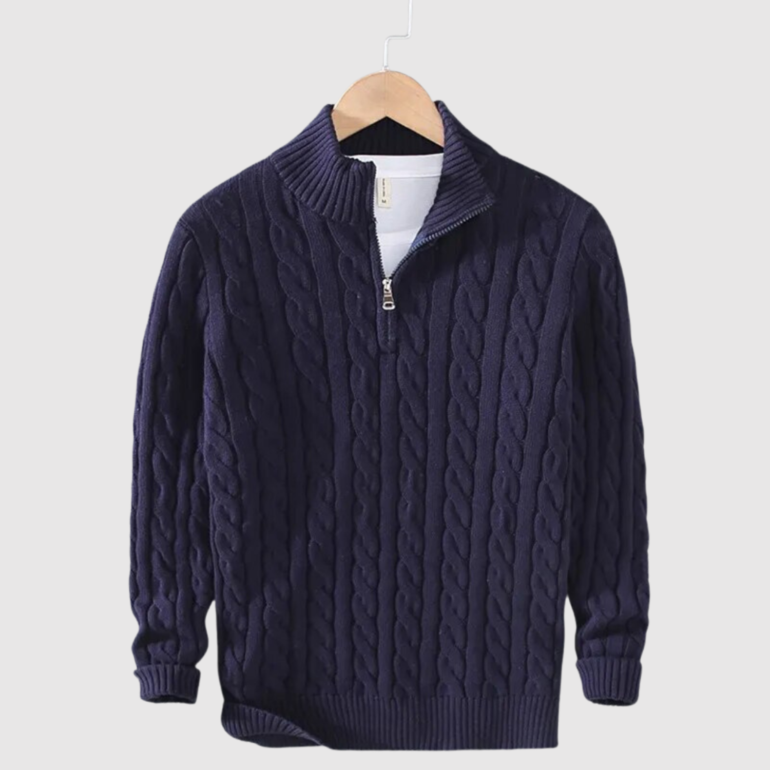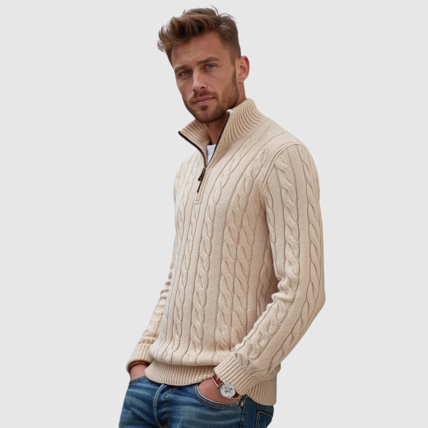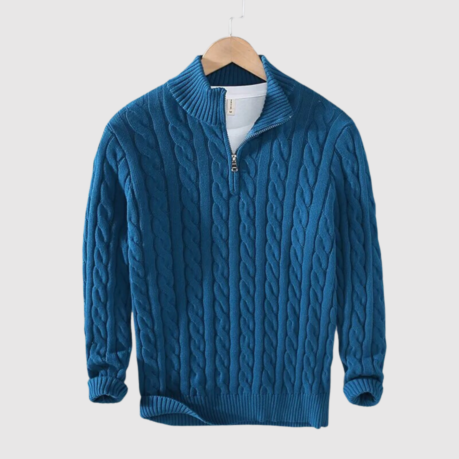Klasisks džemperis ar modernu kabelu rakstu un rāvējslēdzēja apkakli, kas apvieno komfortu un stilu. Ideāli piemērots daudzslāņu izskatam vai atsevišķi kā stilīgs ikdienas izvēle.