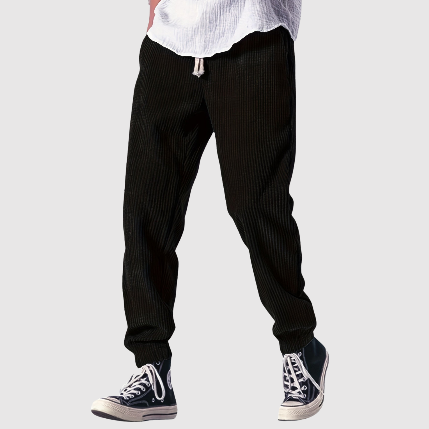 Šīs bikses nodrošina atbrīvotu, bet modernu izskatu. Mīkstā tekstūra un elastīgā josta ar auklu padara tās gan praktiskas, gan stilīgas – ideālas ikdienai.